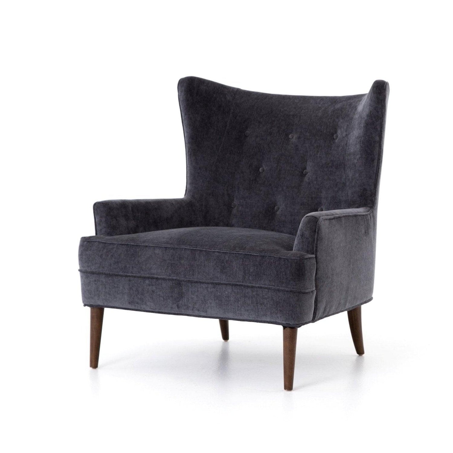 - Una versión elegante de mediados de siglo del tradicional sillón orejero, con capitoné hecho a mano, costuras acentuadas y una sofisticada tapicería de color gris carbón.