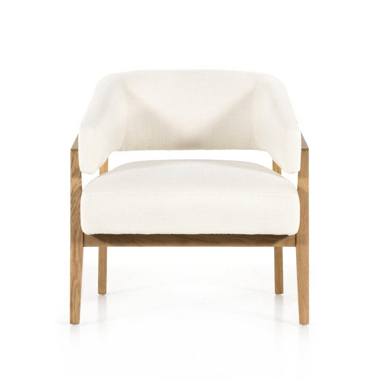 - Con un marco envuelto de roble macizo con acabado miel, los asientos inspirados en mediados de siglo se modernizan gracias a una tela de alto rendimiento en un blanco cremoso y nítido.