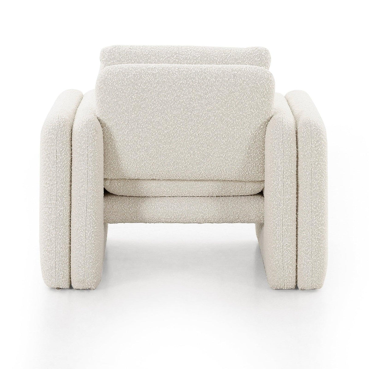- Con un toque de dramatismo inspirado en los años ochenta, la doble canalización agrega un aspecto lineal y en capas a los asientos con detalles tapizados en bouclé, con acolchado suelto en una mezcla de fibras de plumas para mayor comodidad.