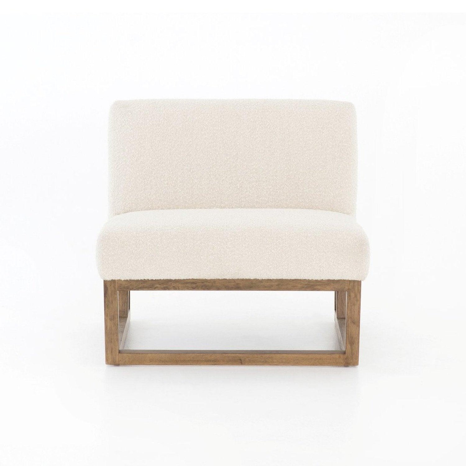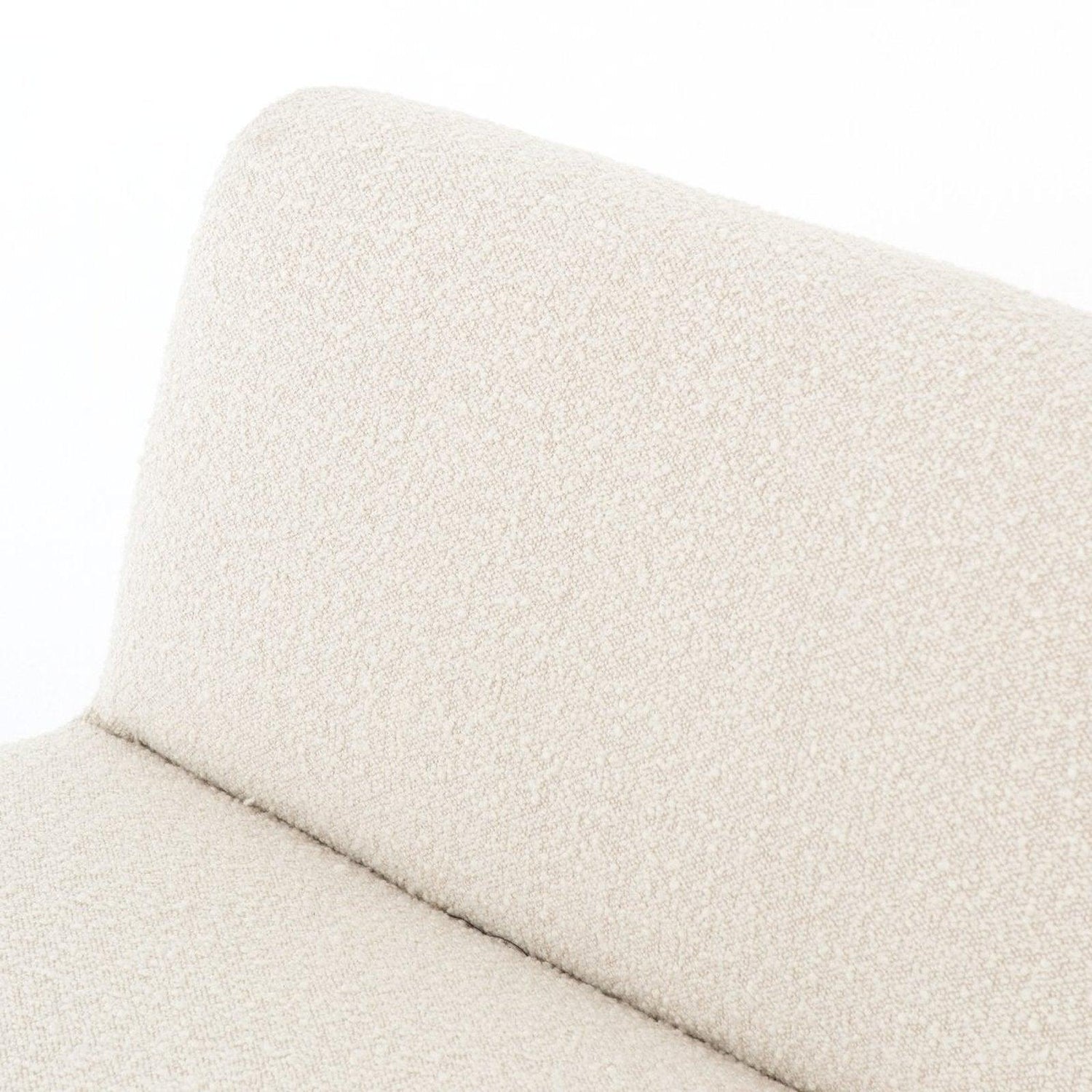 - Los asientos de estilo bajo están tapizados en un suave bouclé de color blanco roto, para darle un toque texturizado al estilo sin brazos.