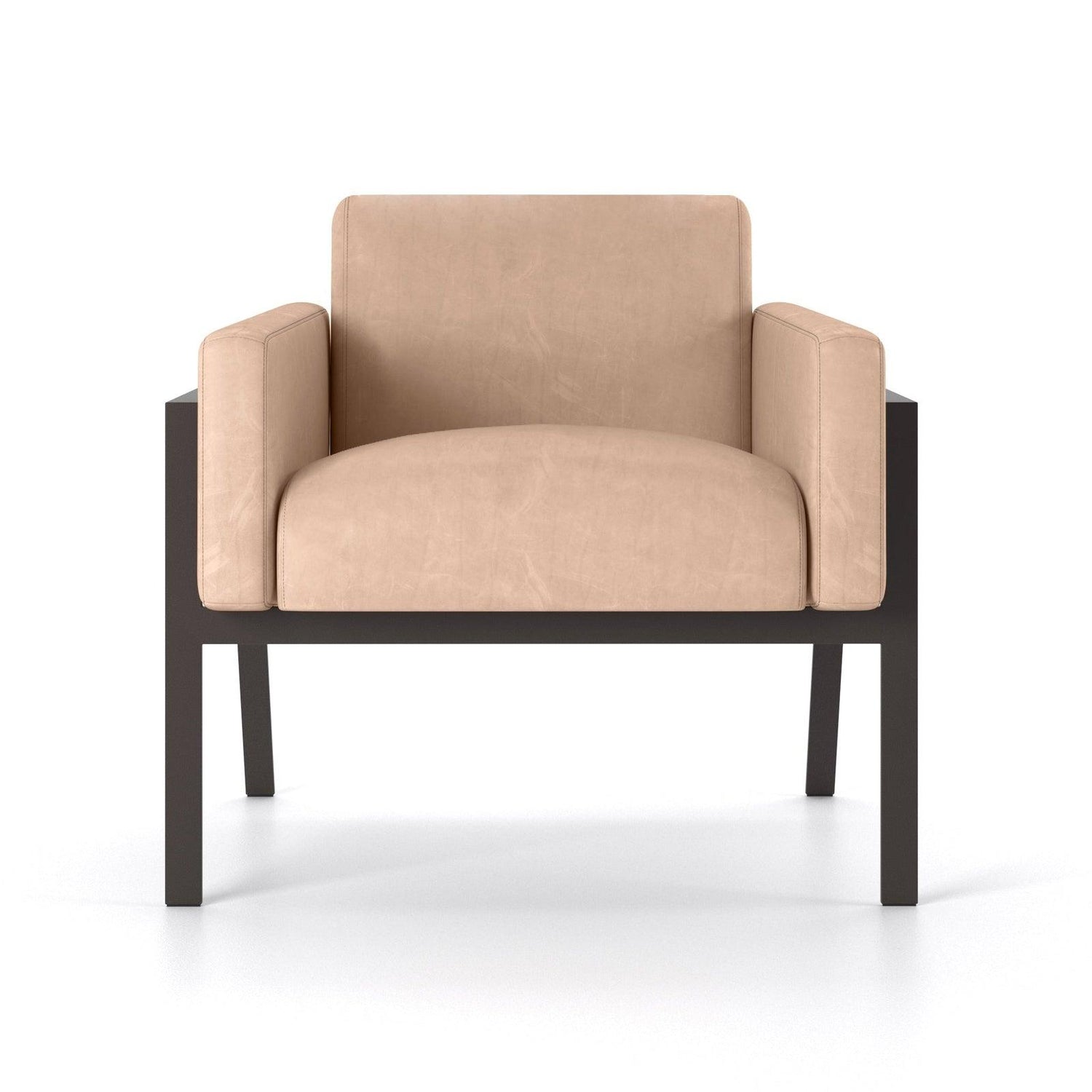 - Con un acabado en bronce metalizado, un marco de hierro plano inspirado en la arquitectura moderna le da aún más estilo a los elegantes asientos de color arpillera de lujoso cuero de primera calidad.