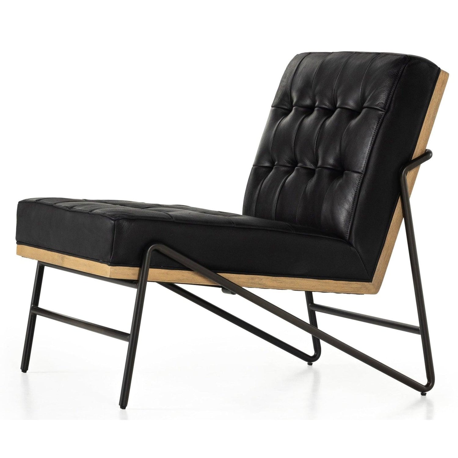 - El hierro angular forma una estructura aireada en forma de horquilla para asientos sin brazos de cuero de grano superior negro, con botones capitoné profundos que le dan textura.