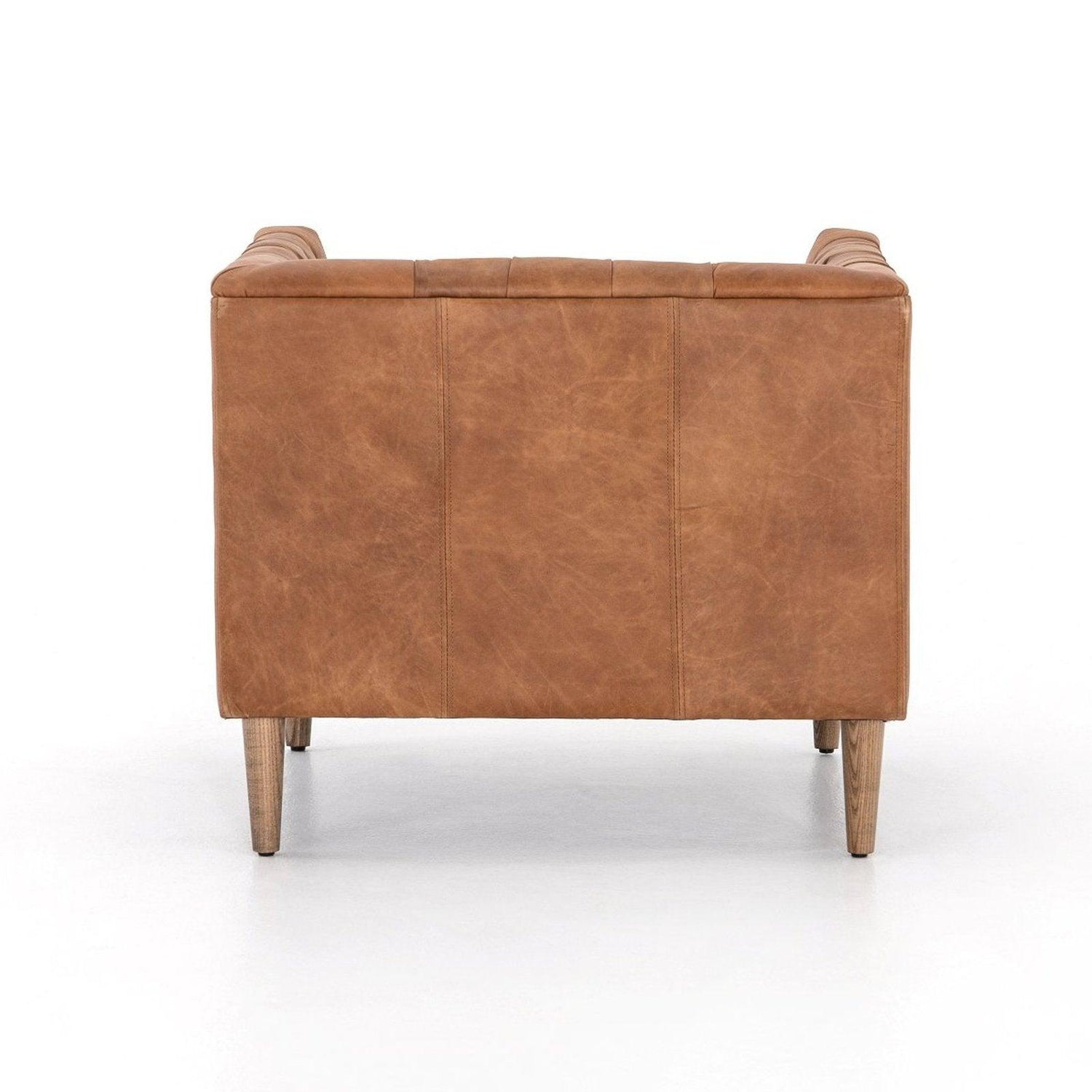 - Los brazos de protección cuadrados y un perfil bajo aportan una dosis de estilo de mediados de siglo a los asientos de cuero de grano superior en un color camello lavado natural.