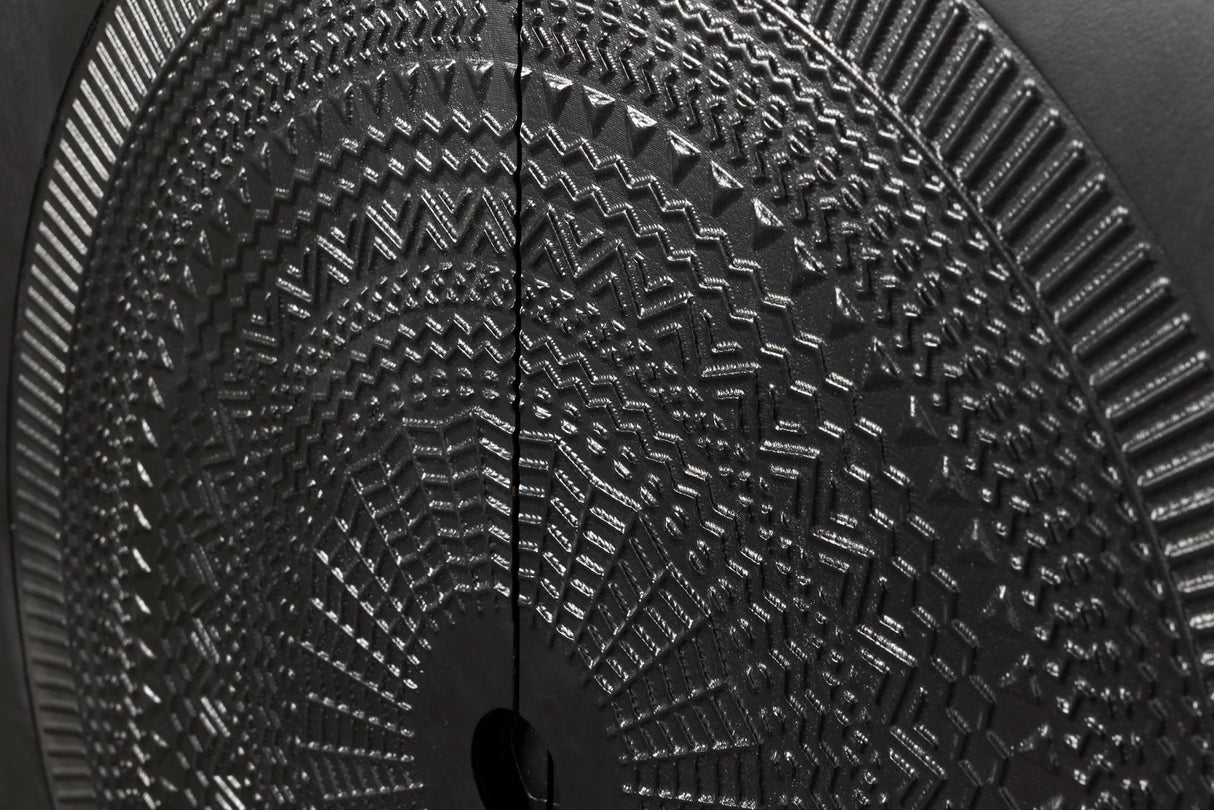 - Cree una apariencia exótica en su espacio moderno o de transición con un audaz mueble bar de madera negra que presenta un marco de hierro abierto y puertas frontales superpuestas de forma circular.
