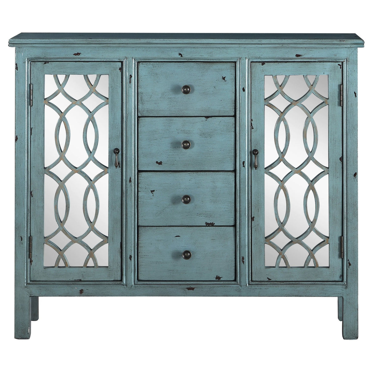 Home Elegance Furniture presenta con orgullo el gabinete decorativo de 4 cajones Rue en azul antiguo | Coaster , una incorporación refinada diseñada para realzar su hogar con un estilo atemporal.