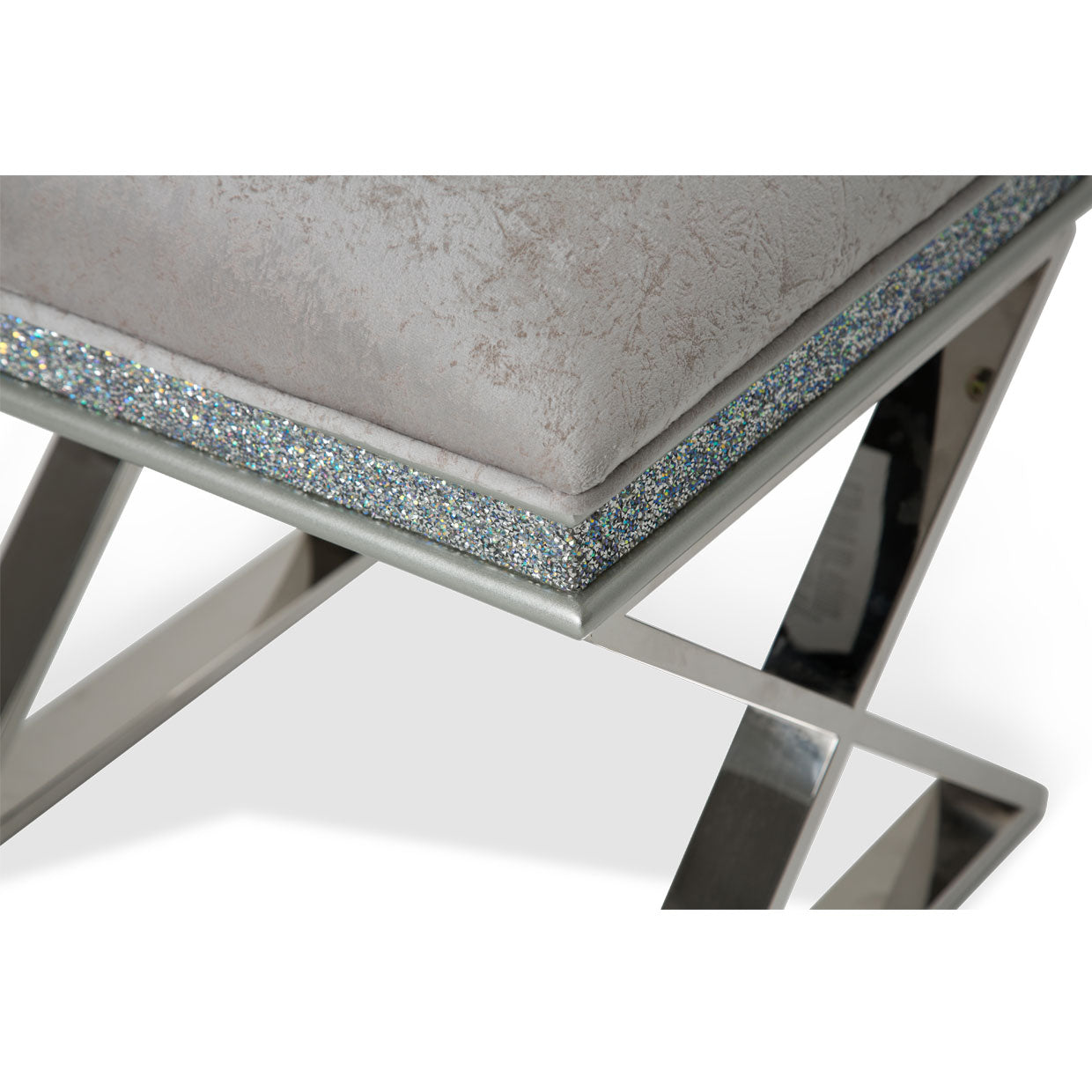 El banco de tocador Melrose Plaza de AICO presenta un acabado color paloma, detalles facetados cristalizados y un estilo moderno: asientos de lujo que complementan cualquier espacio de tocador.