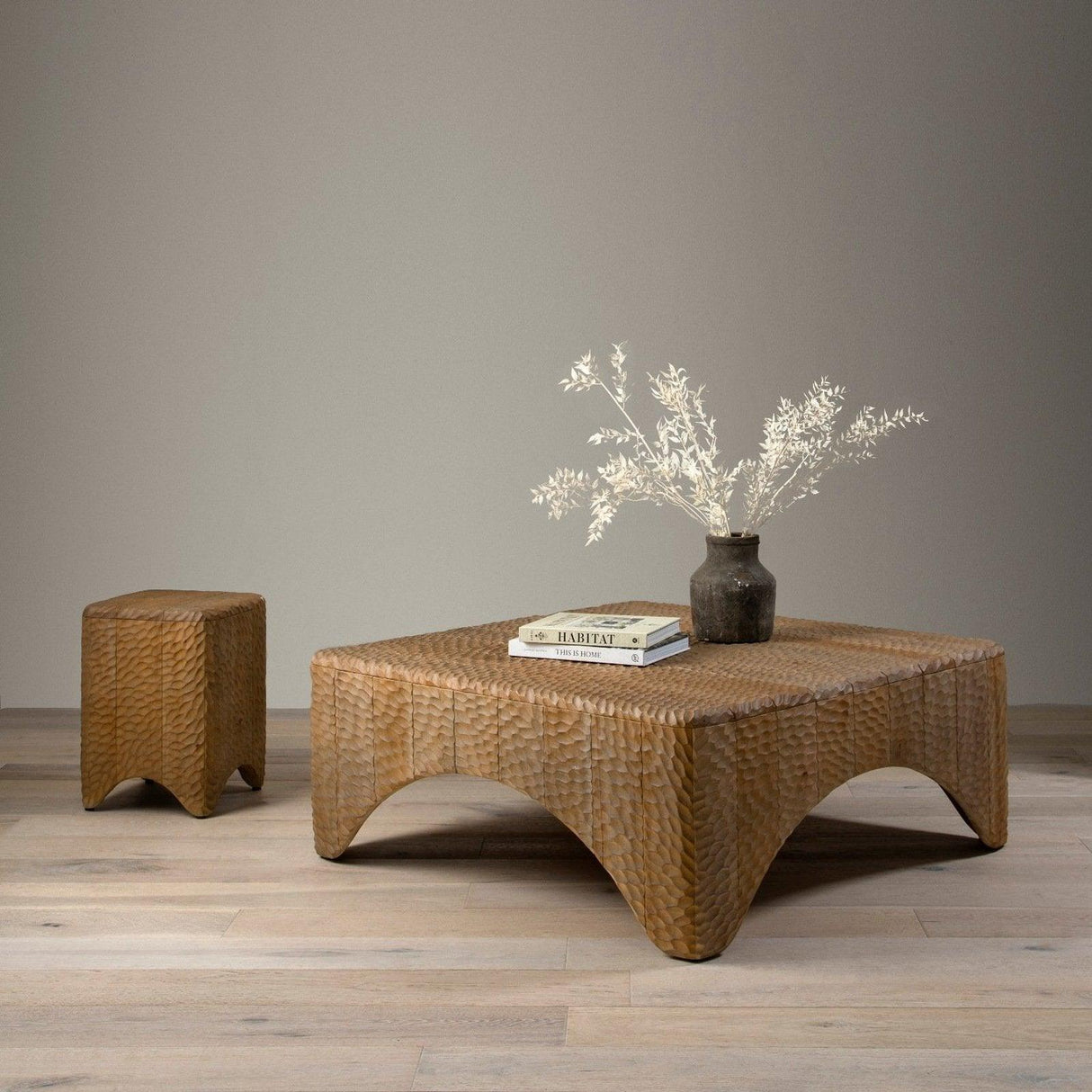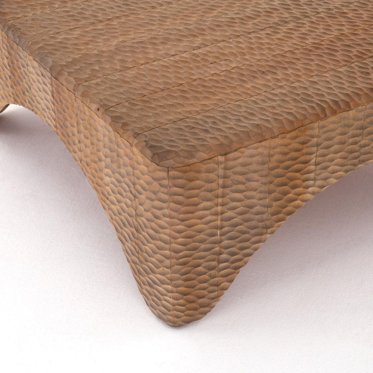 - Inspirada en los raros frascos de sake del siglo XVIII, la caoba maciza está tallada a mano cuidadosamente, creando un aspecto texturizado con hoyuelos y matices cálidos blanqueados por el sol.