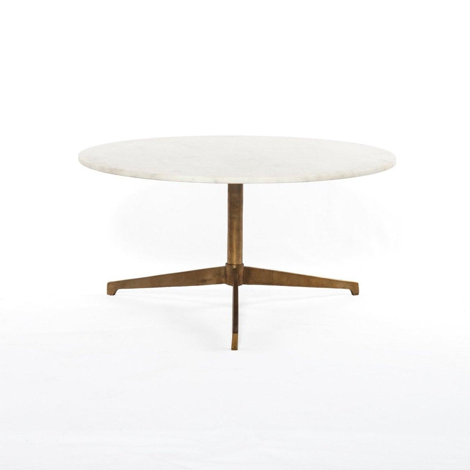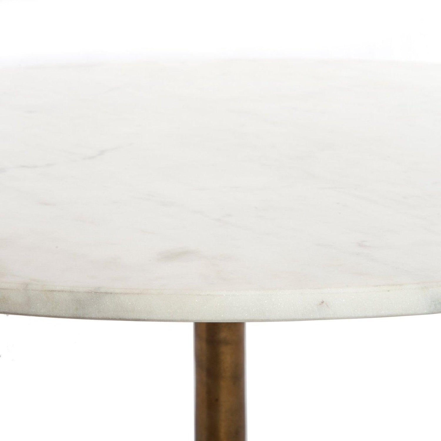 - Una delgada base de trípode de latón crudo sostiene una mesa redondeada de mármol blanco pulido.