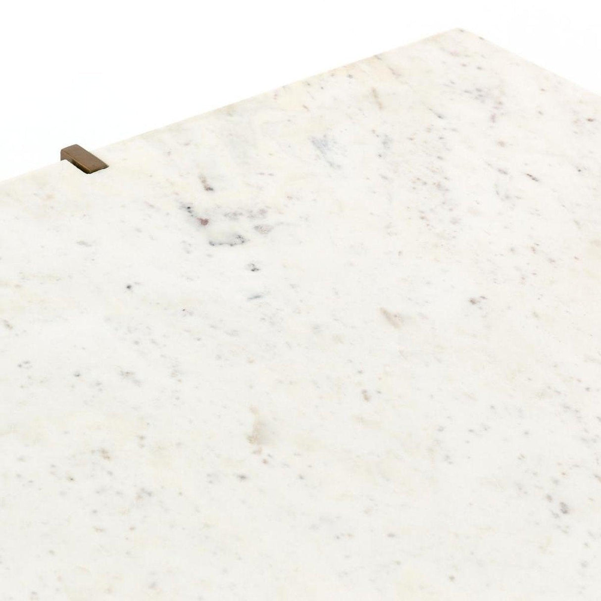 - El hierro delgado con acabado de latón antiguo forma una X para sostener niveles de metal perforado y mármol blanco pulido, aportando una apariencia de simple gracia a la mesa de café moderna.