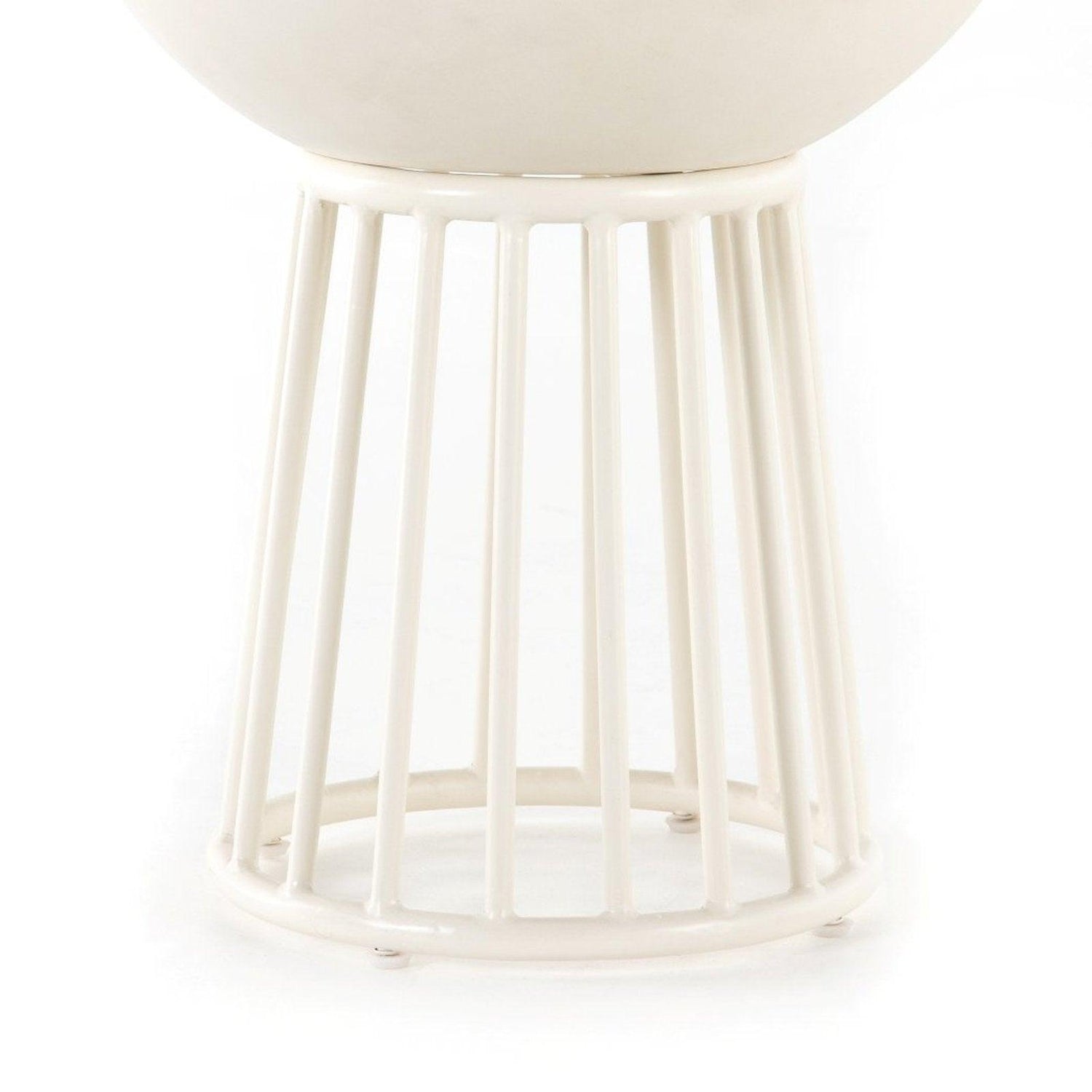 - Para un juego fresco de estilo monocromático, una base de hierro aireada con forma de jaula sostiene una mesa en forma de cuenco de hormigón con acabado blanco.