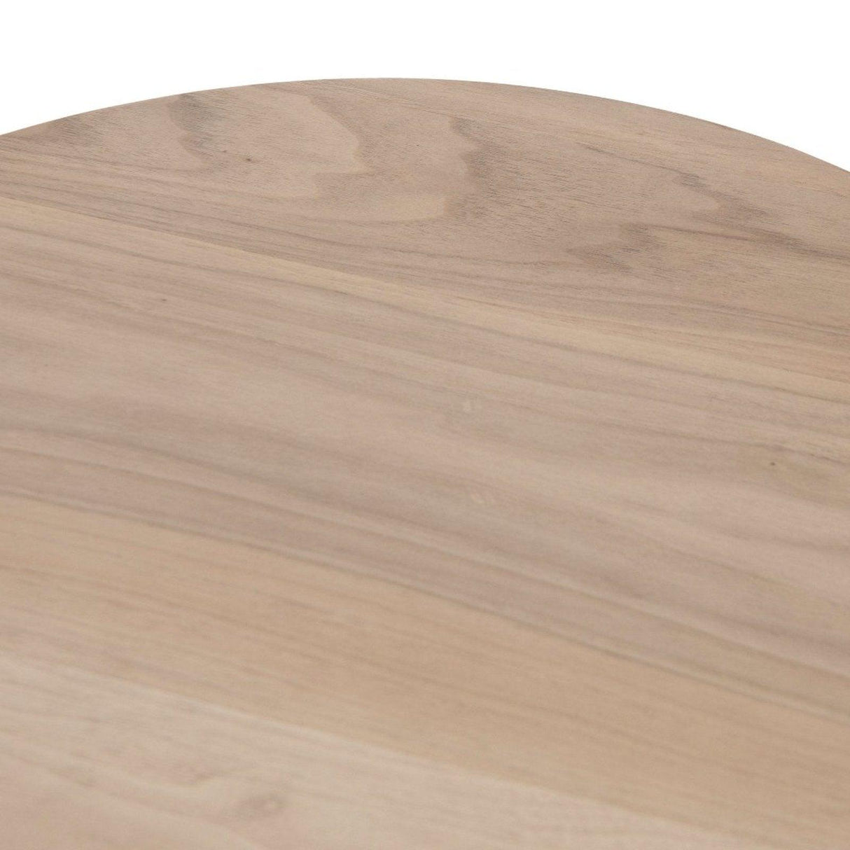 - Las impresionantes fuerzas de la naturaleza se capturan en una mesa auxiliar redondeada de nogal ceniciento sobre una sutil base de hierro.
