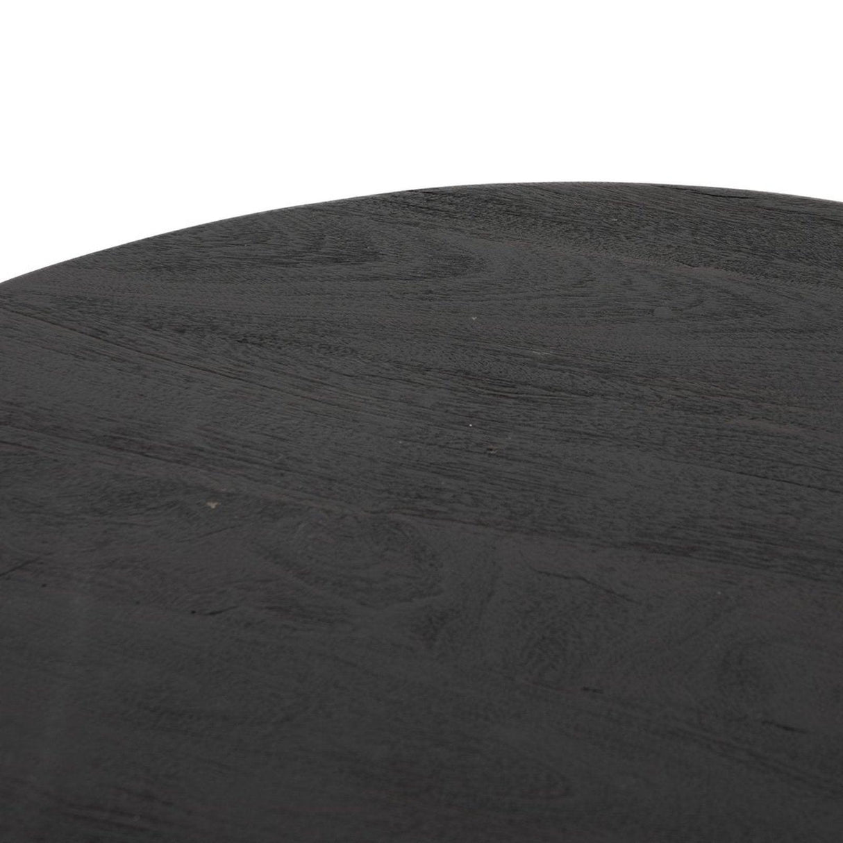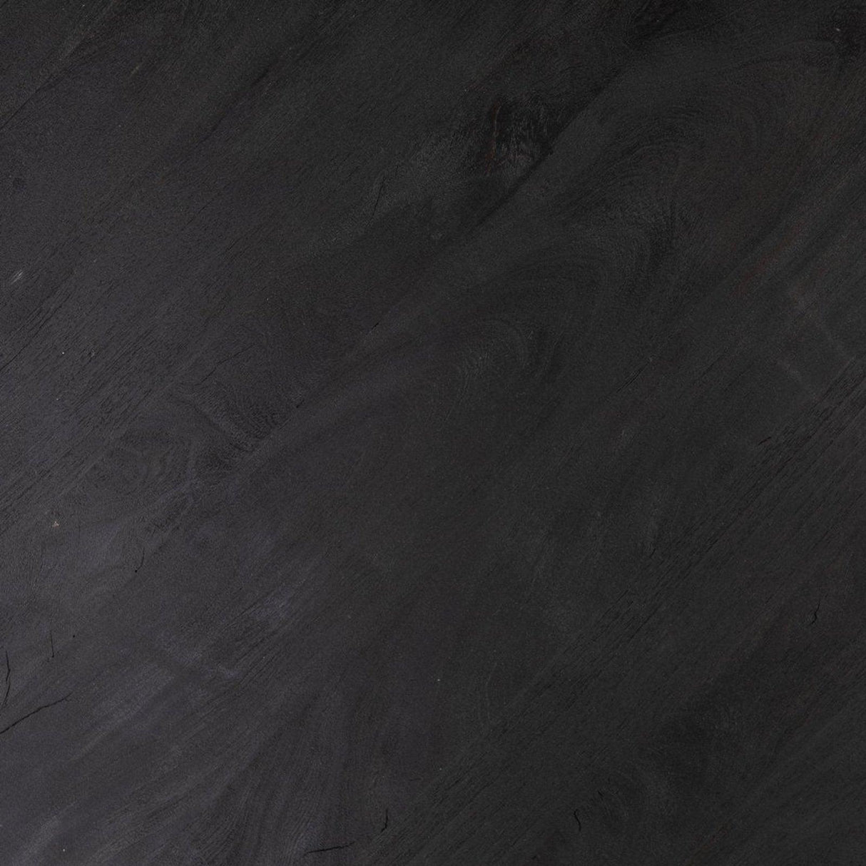 - Unas patas sólidas y bien formadas sostienen una mesa delgada y redondeada de maderas recuperadas con acabado en negro claro, para lograr una apariencia global y orgánica y un ambiente artesanal.