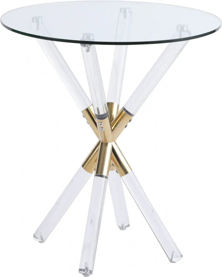 Dale un toque moderno a tu sala con esta mesa auxiliar Mercury de acrílico dorado de Meridian Furniture. La base presenta un diseño de pedestal con patas de acrílico dorado para un toque moderno y divertido. El tablero de vidrio templado ofrece amplio espacio para colocar objetos como fotos enmarcadas o revistas. El tablero es transparente, por lo que puedes apreciar fácilmente la belleza de las patas metálicas, dándole a tu sala o estudio un toque especial.