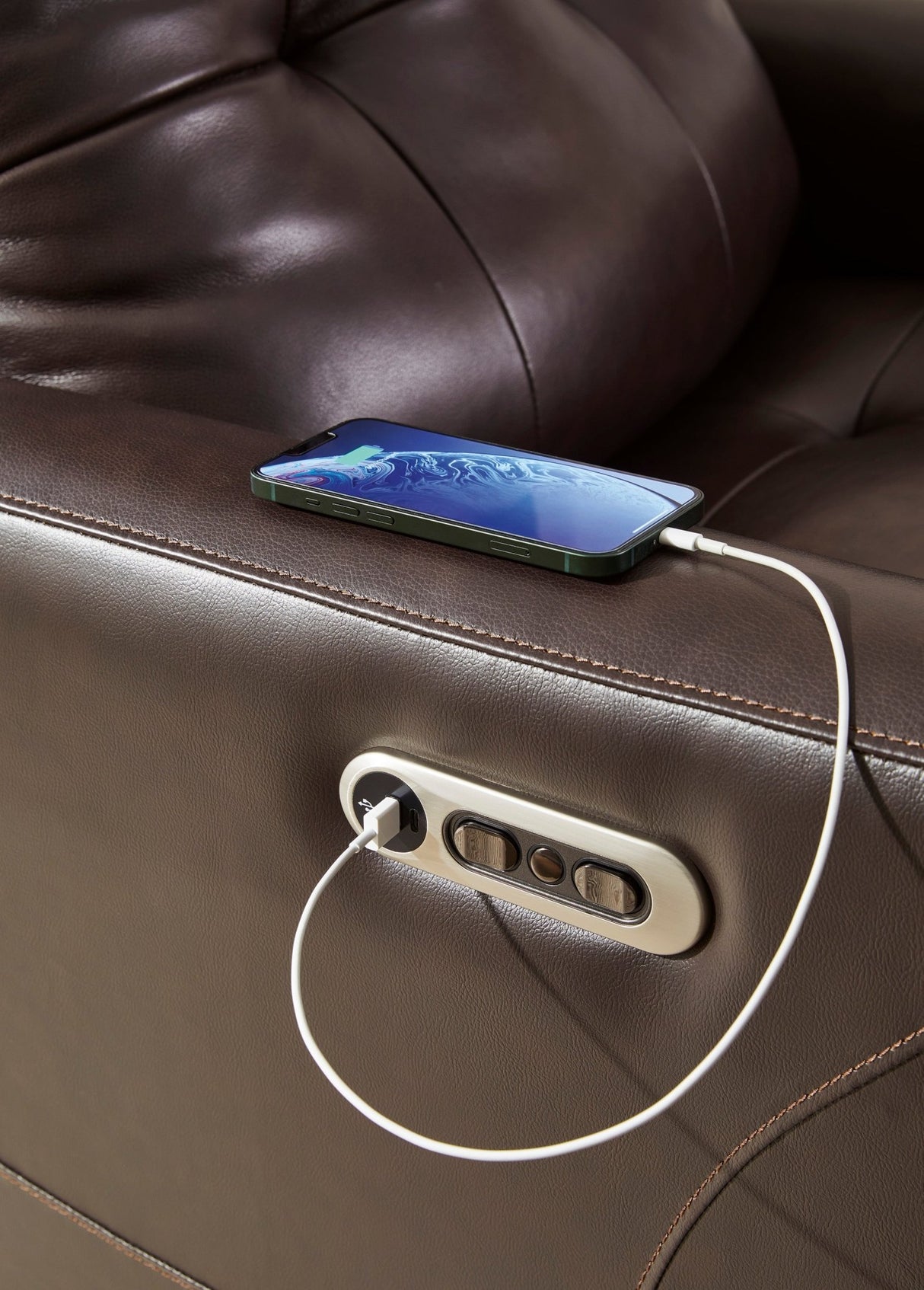 Home Elegance Furniture presenta con orgullo el sillón reclinable PWR Pisgham PWR/reposacabezas ADJ de cuero en color chocolate de Ashley , una incorporación refinada diseñada para realzar su hogar con un estilo atemporal.