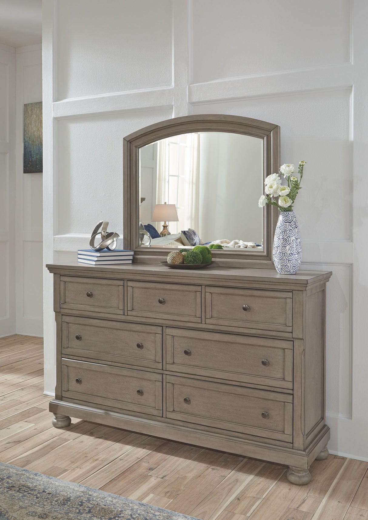 Lettner - Gris claro - 6 piezas - Cómoda, espejo, cómoda, cama tamaño queen con dos cajones