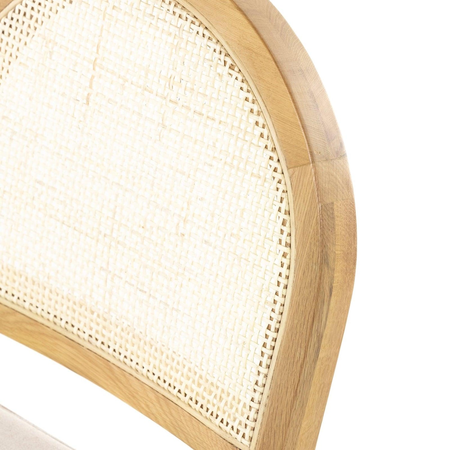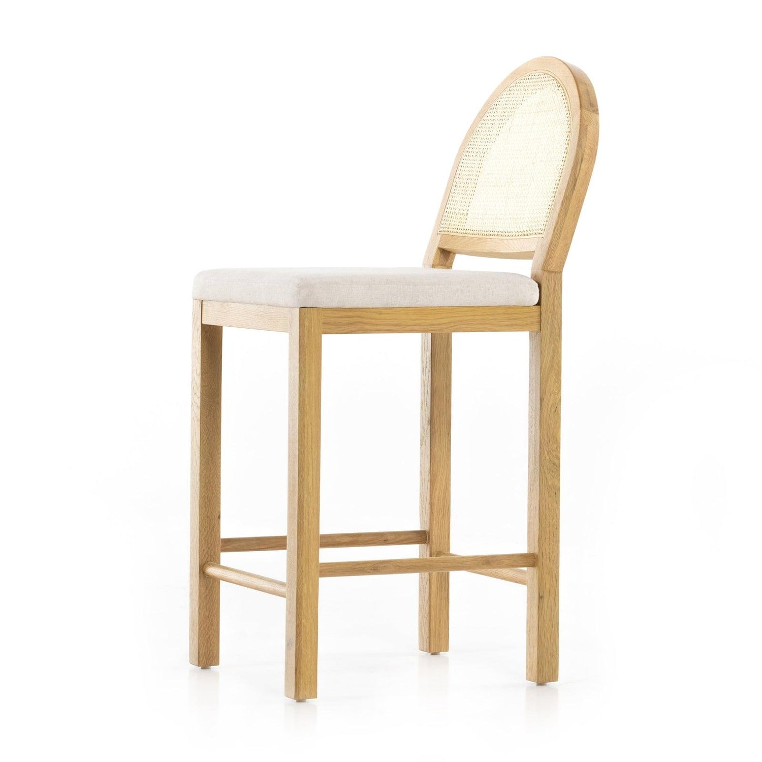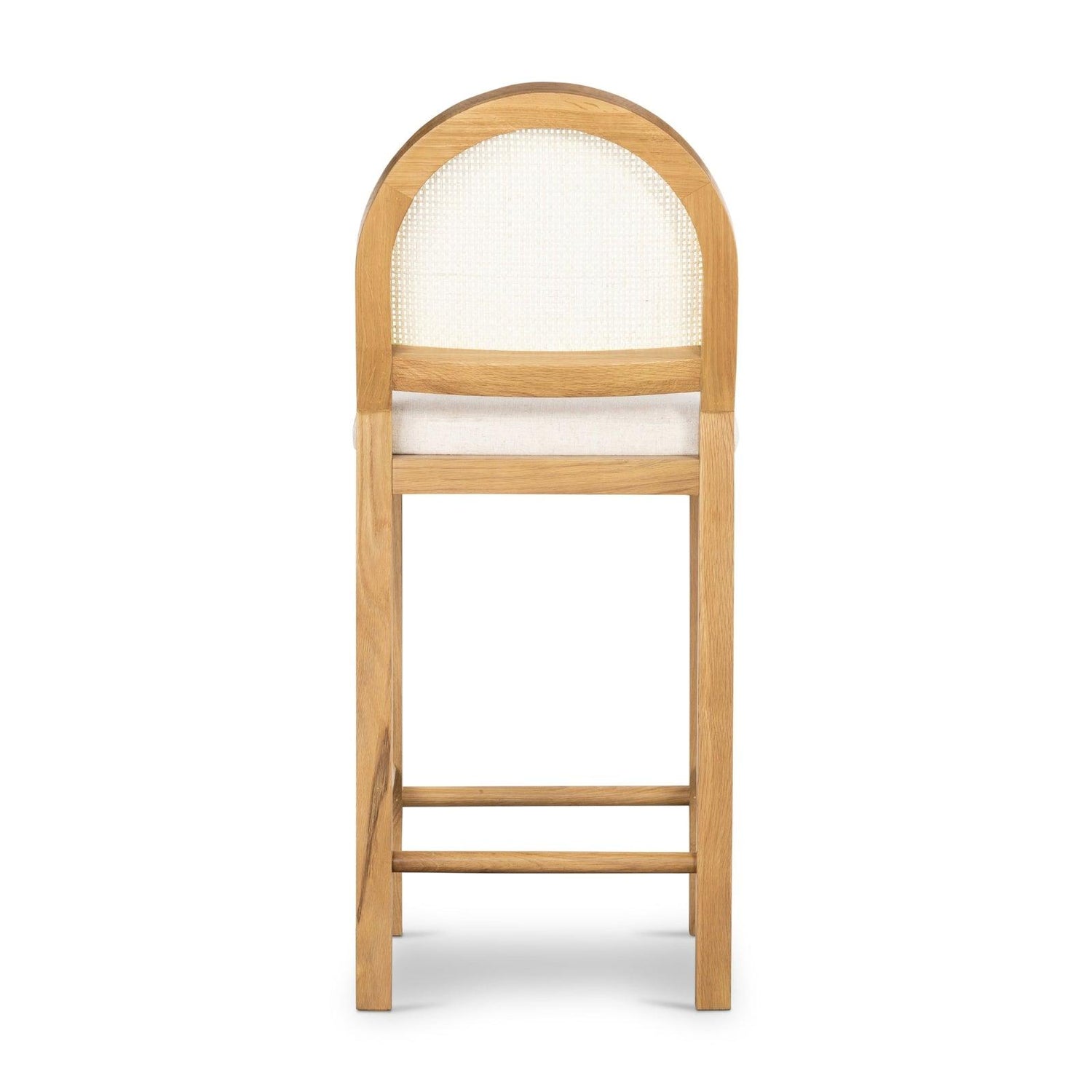 - El roble con acabado miel forma un taburete de mostrador con respaldo de caña y bellamente arqueado, con asientos de alto rendimiento para una sensibilidad elegante.