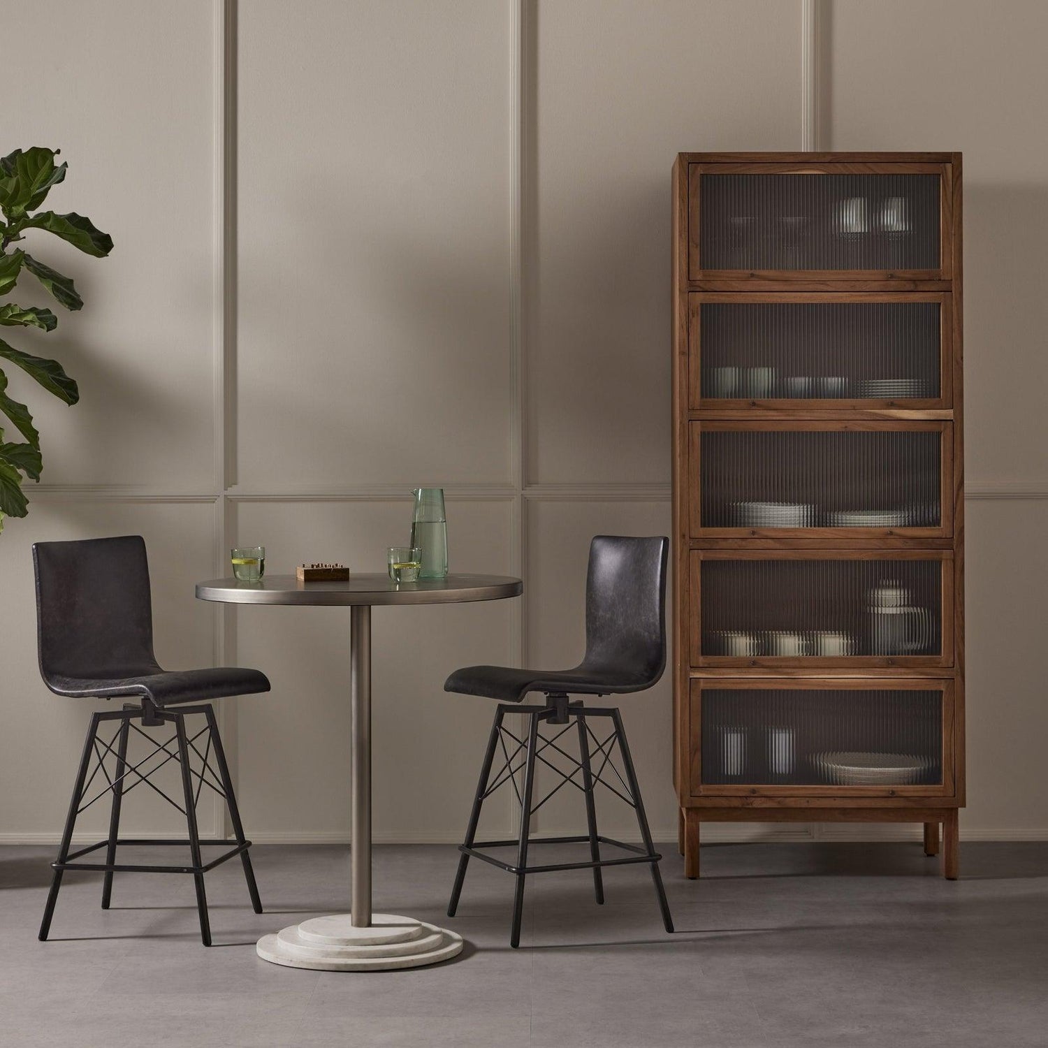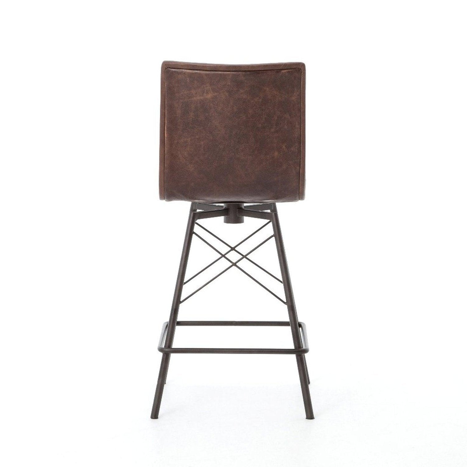 - Las modernas curvas en forma de S en cuero sintético desgastado, marrón y negro giran 360 grados sobre una base arquitectónica de hierro encerado en negro.