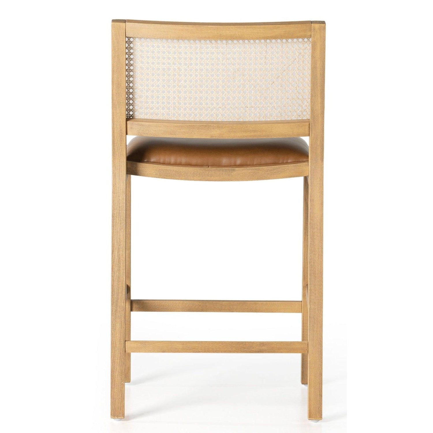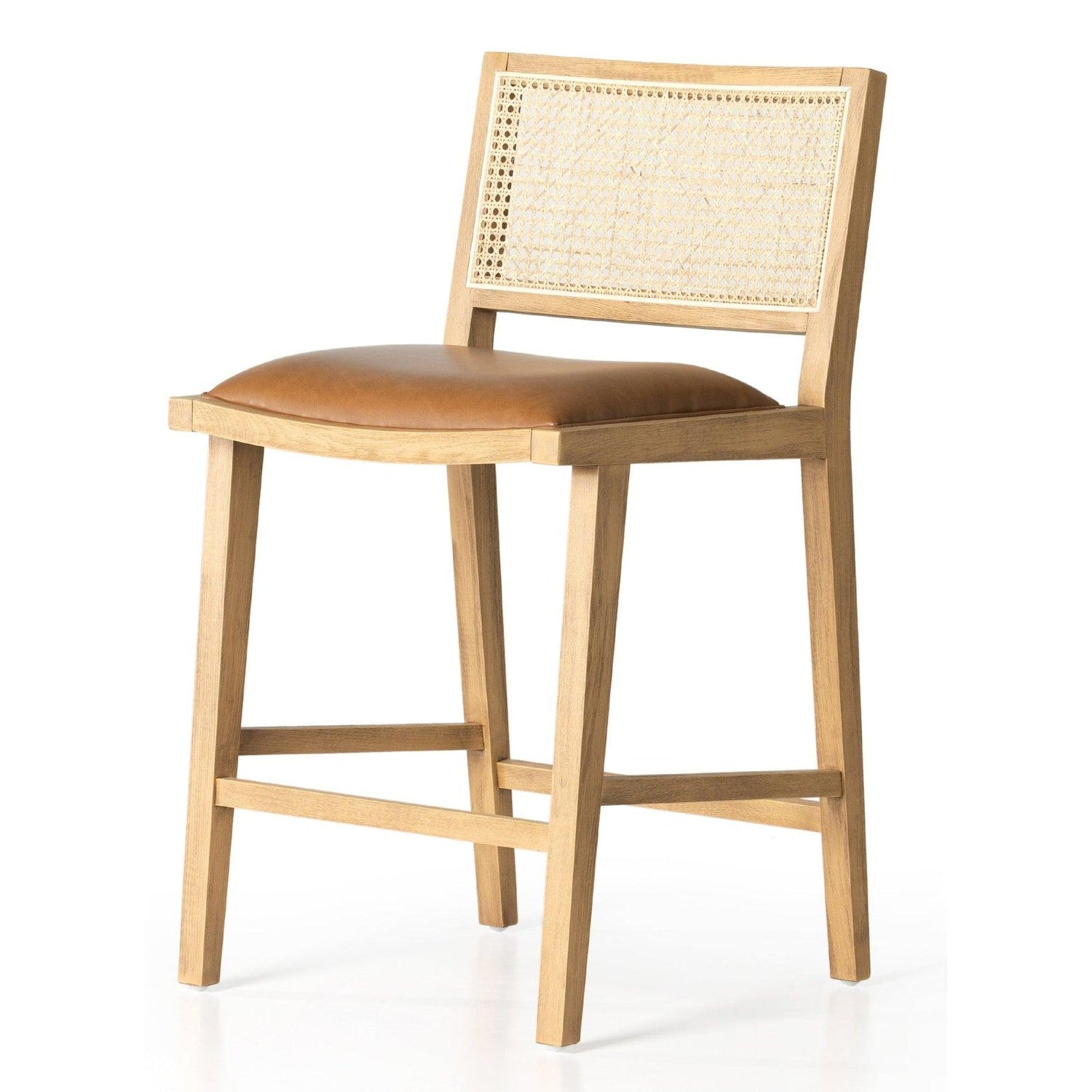 - La madera maciza de haya natural cuenta con un respaldo de caña natural para una textura adicional, mientras que un asiento de cuero sintético con acabado caramelo brinda comodidad total.