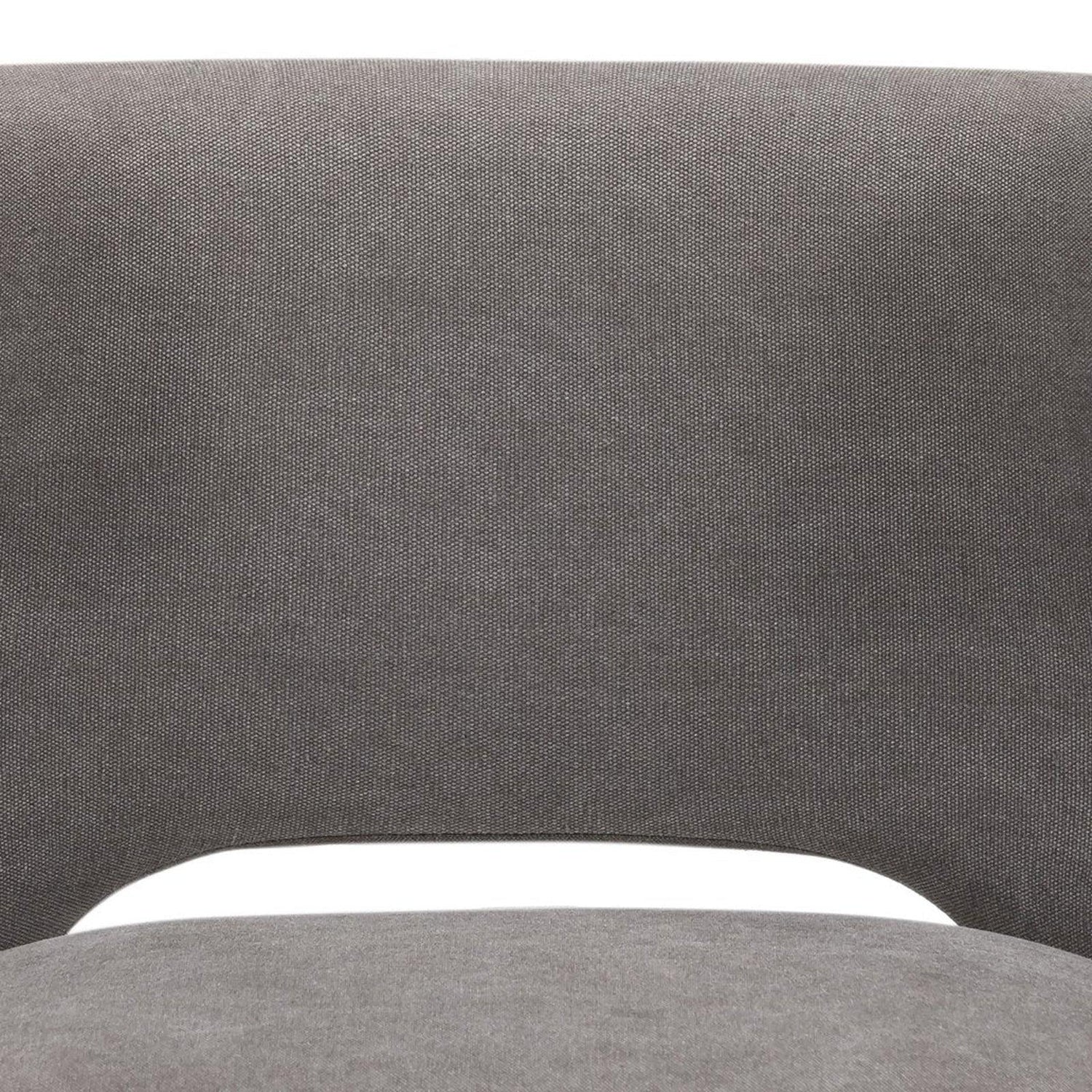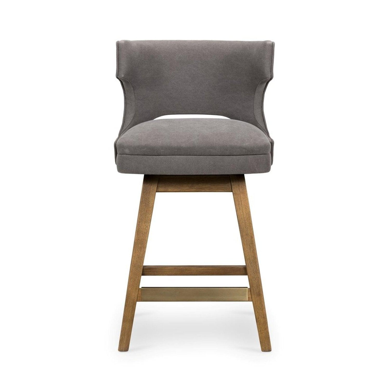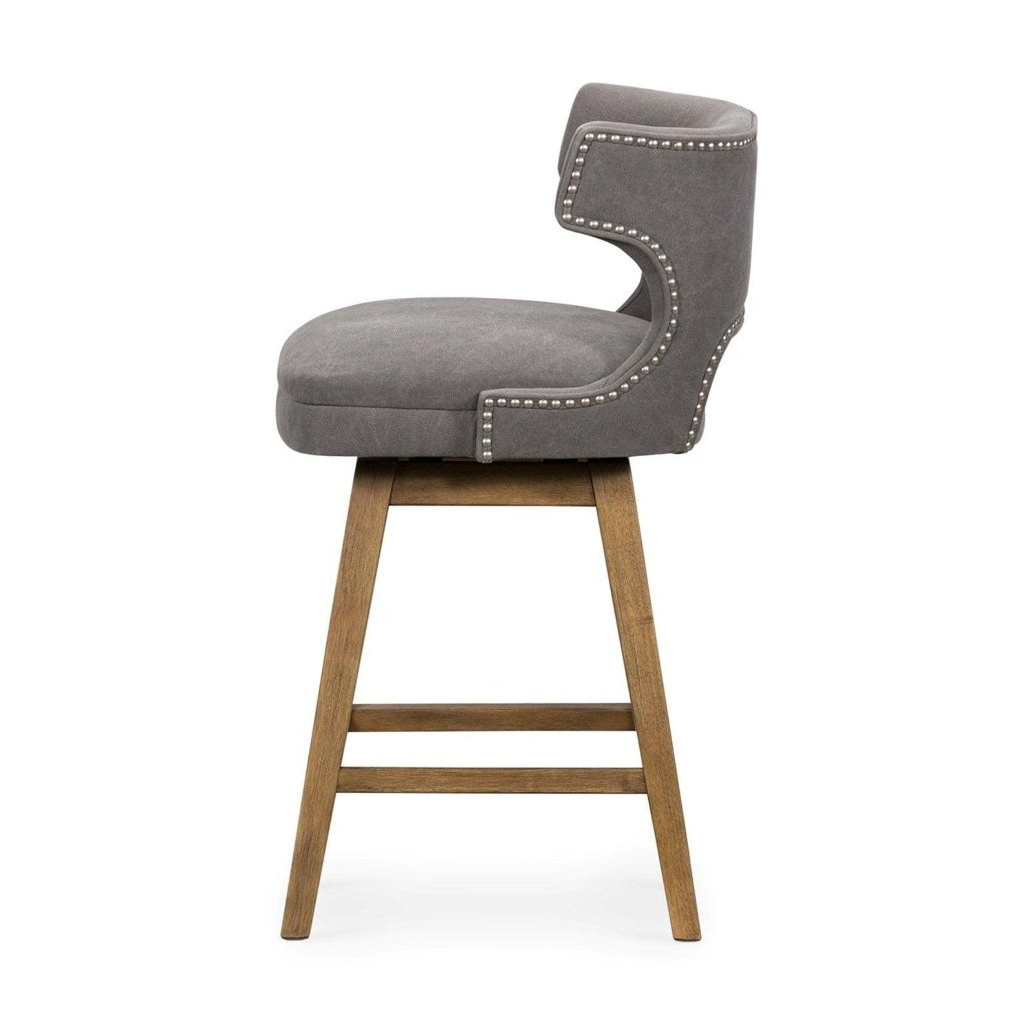 - Un lienzo gris suave con tachuelas de peltre, una forma de ala moderna y patas de madera de ortiga extendidas aportan una presencia contemporánea al mostrador.
