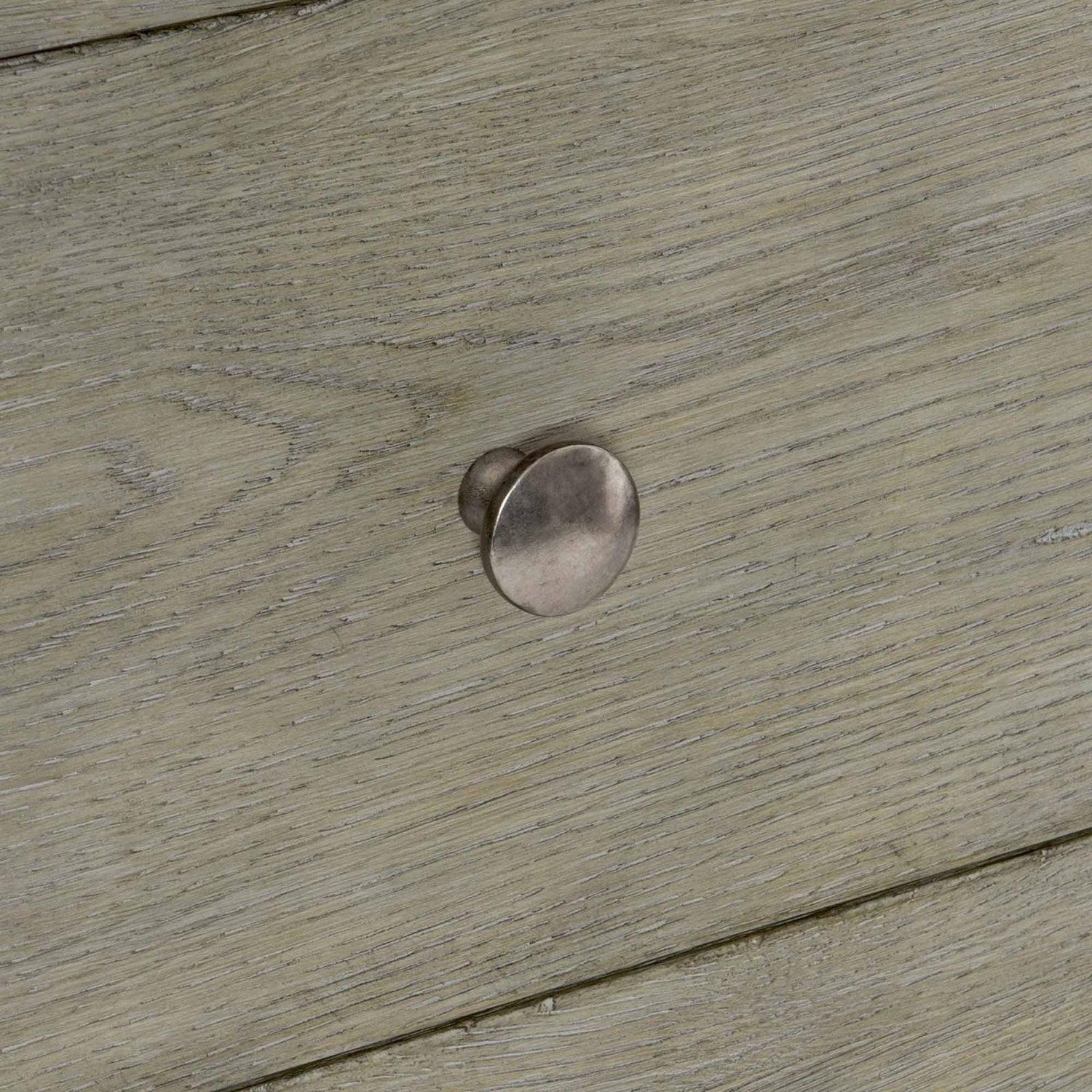 Fabricada con roble blanco macizo y chapa de roble nudoso con acabado peltre. Acentuada con herrajes rústicos de zinc fundido que le dan un aspecto texturizado y desgastado.