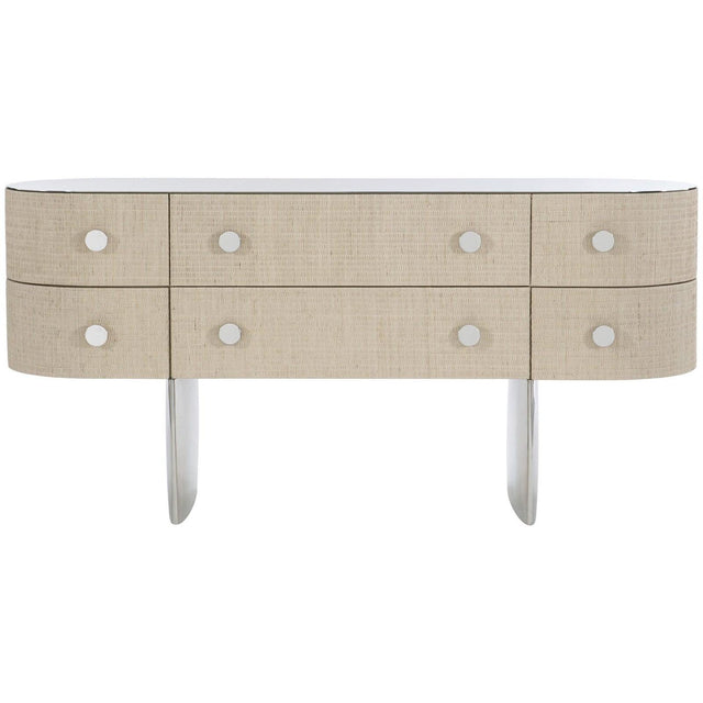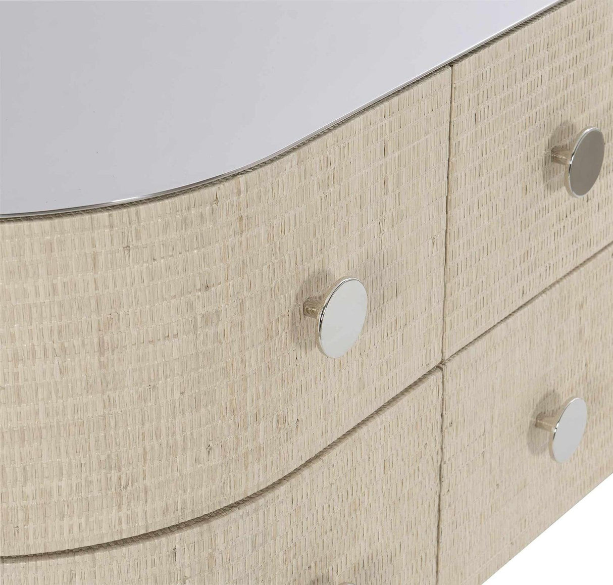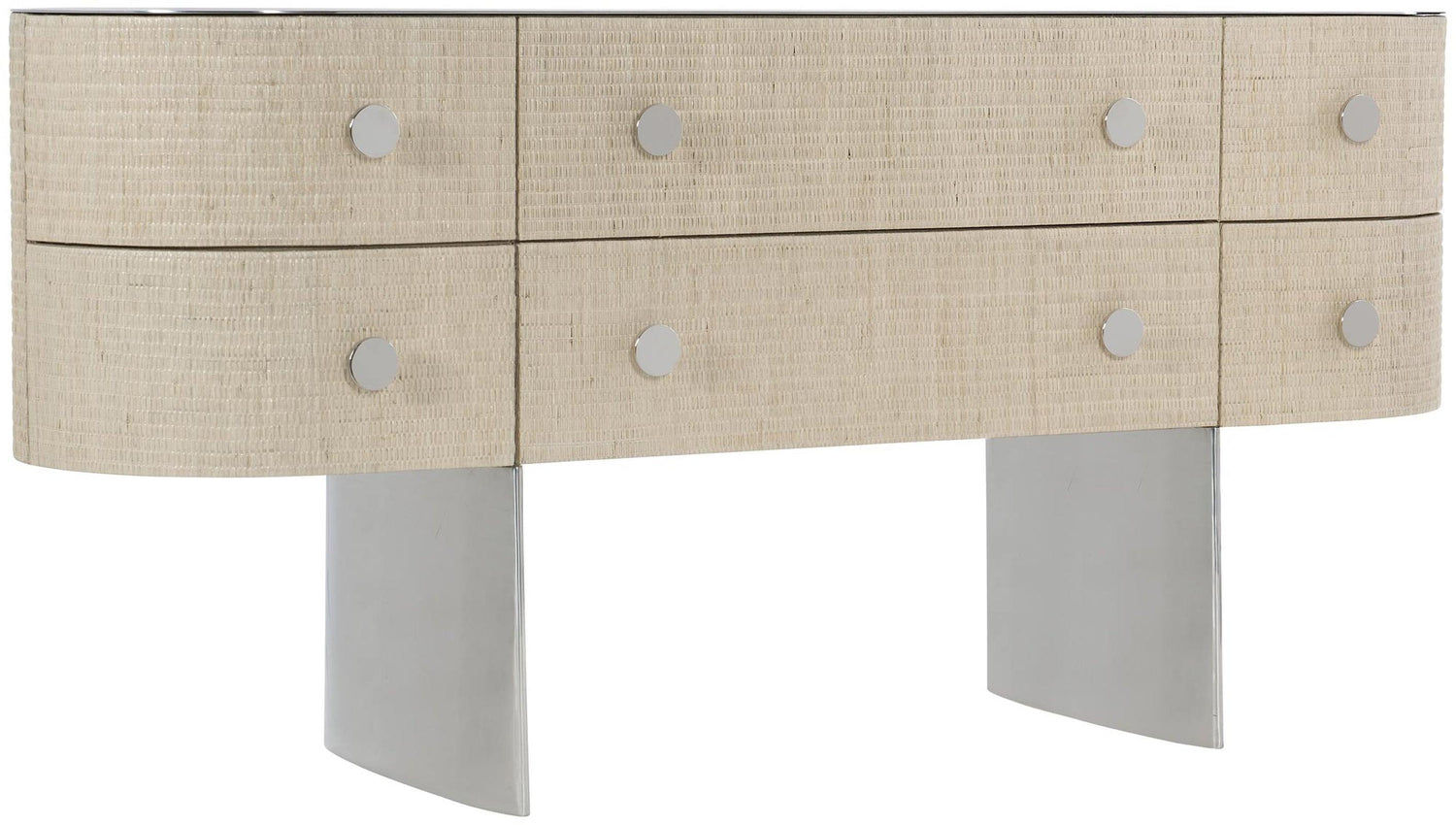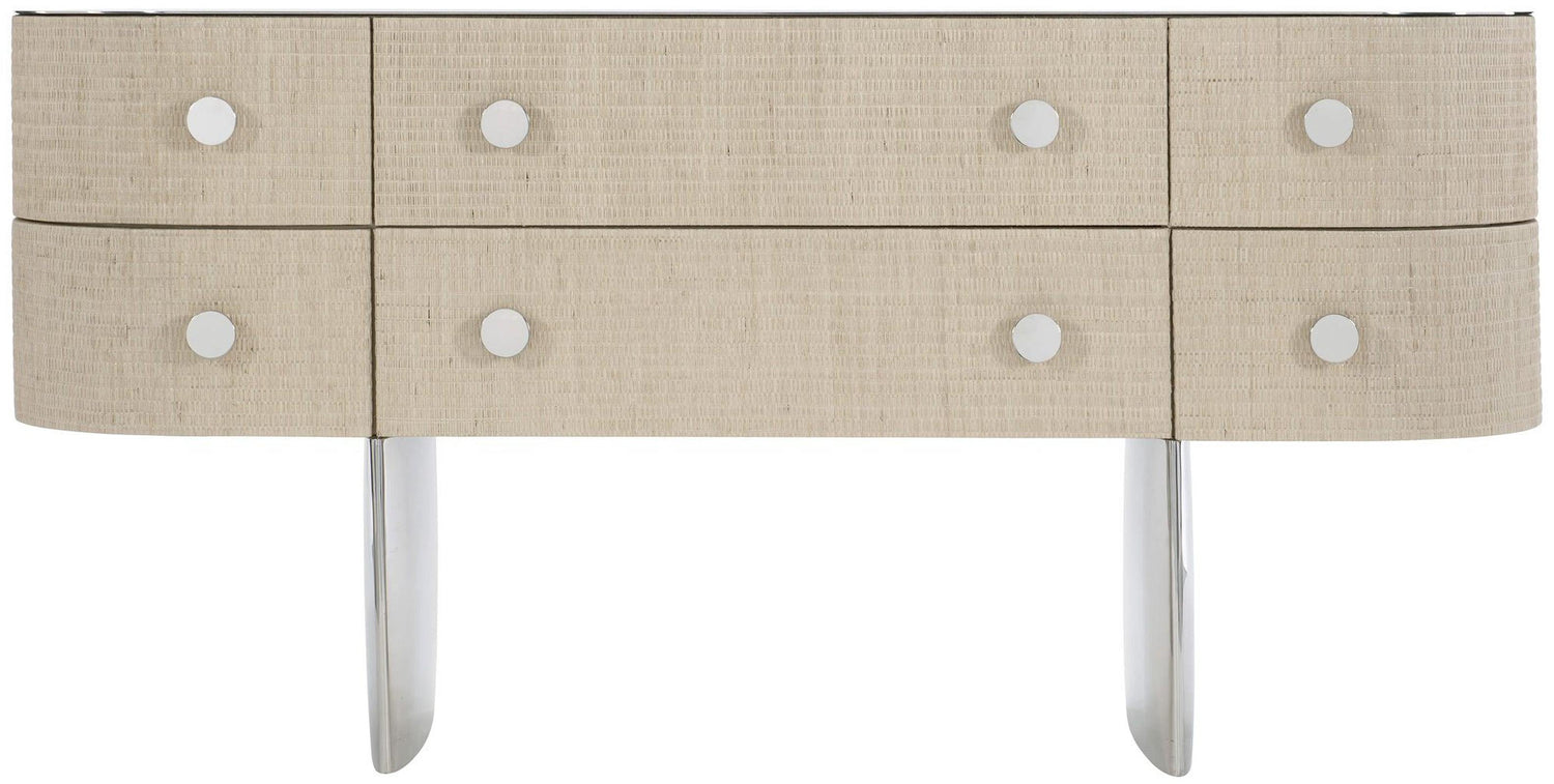 Bien equilibrada y sobria, esta cómoda de seis cajones combina rafia tejida con acero elegante para lograr una apariencia limpia y moderna.