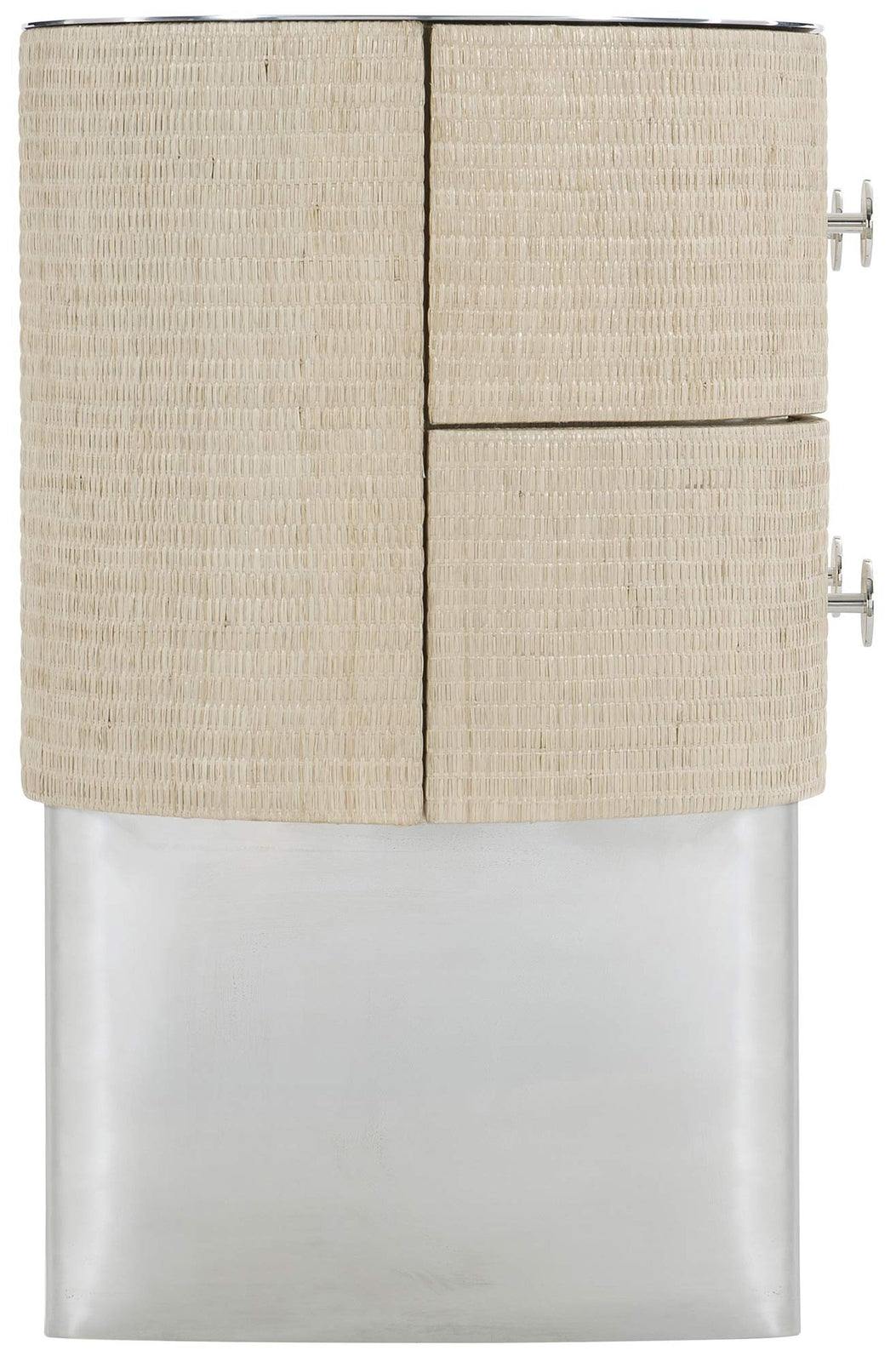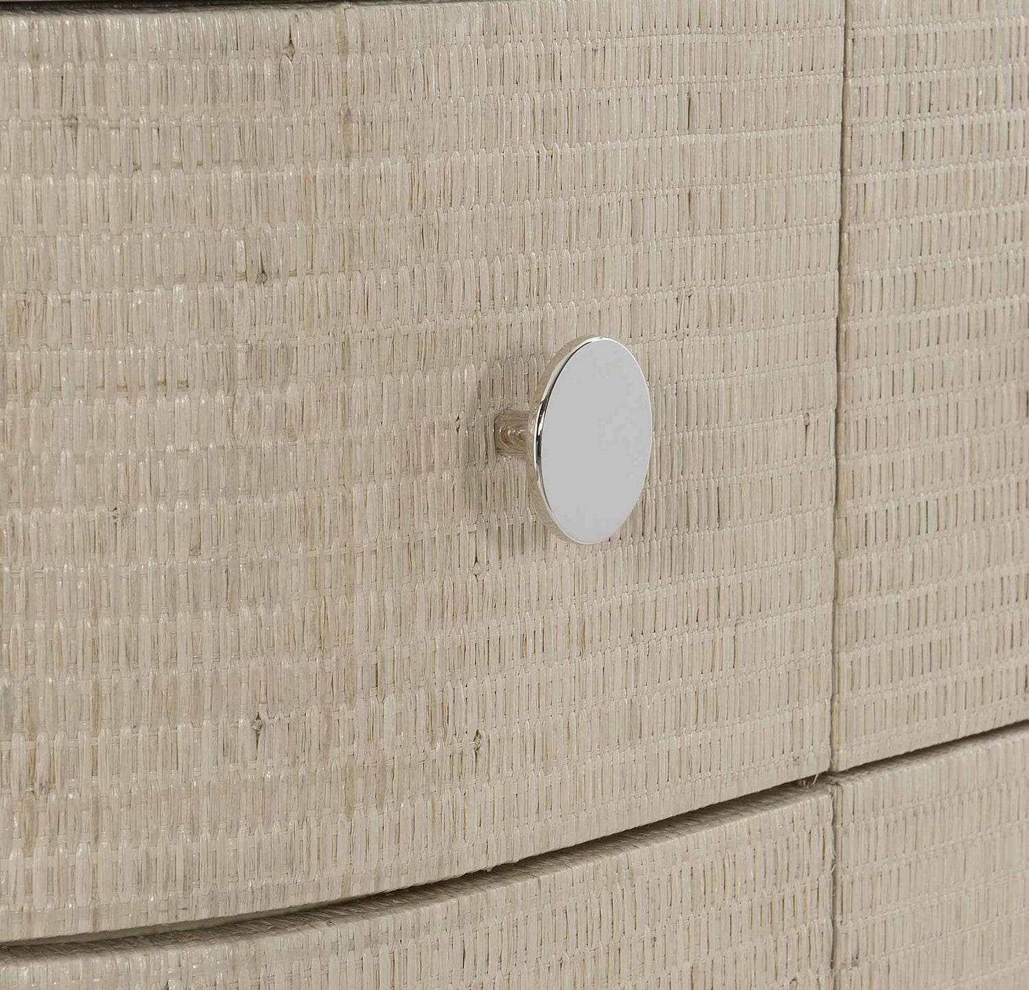 - Parte superior de acero inoxidable pulido. El resto de la superficie exterior de la caja está recubierta de rafia blanqueada. Seis cajones con cierre suave. Placa con el nombre de Bernhardt en el cajón superior izquierdo.