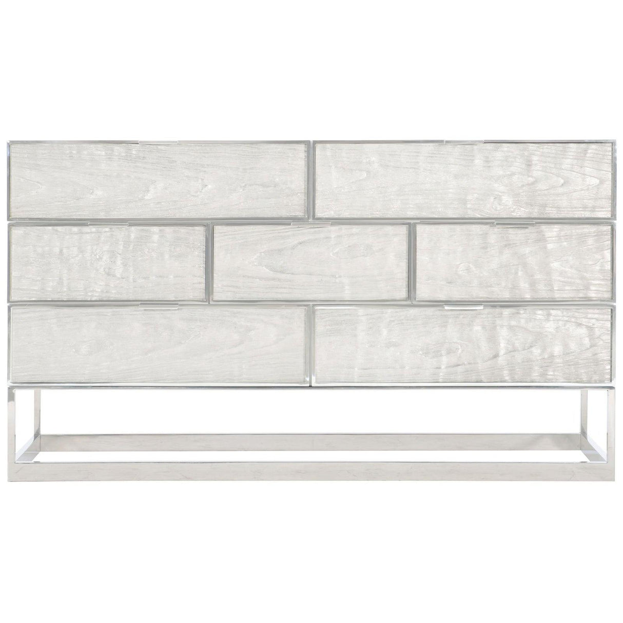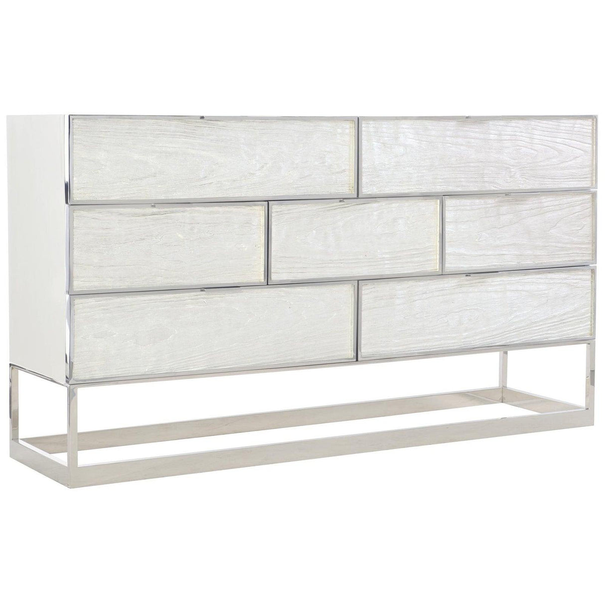 La cómoda Parkhurst de Bernhardt Interiors eleva el almacenamiento con laca blanca de alto brillo , arquitectura de acero inoxidable pulido y siete cajones funcionales : un punto focal glamoroso con facilidad de uso diario.