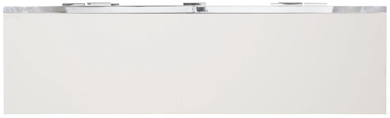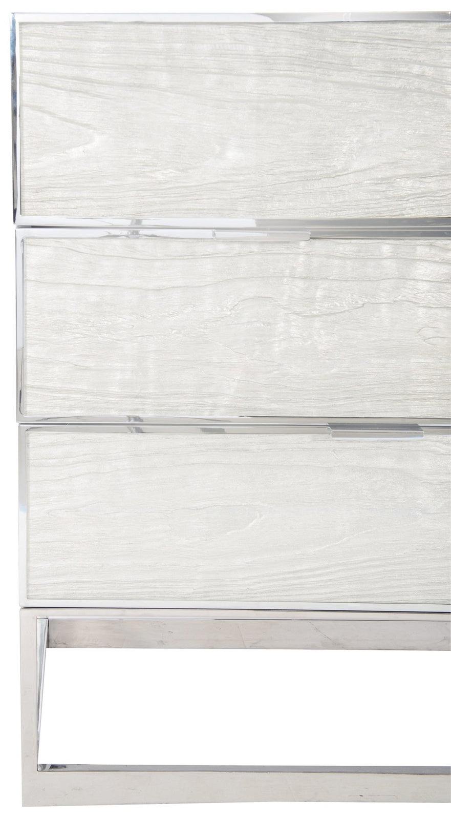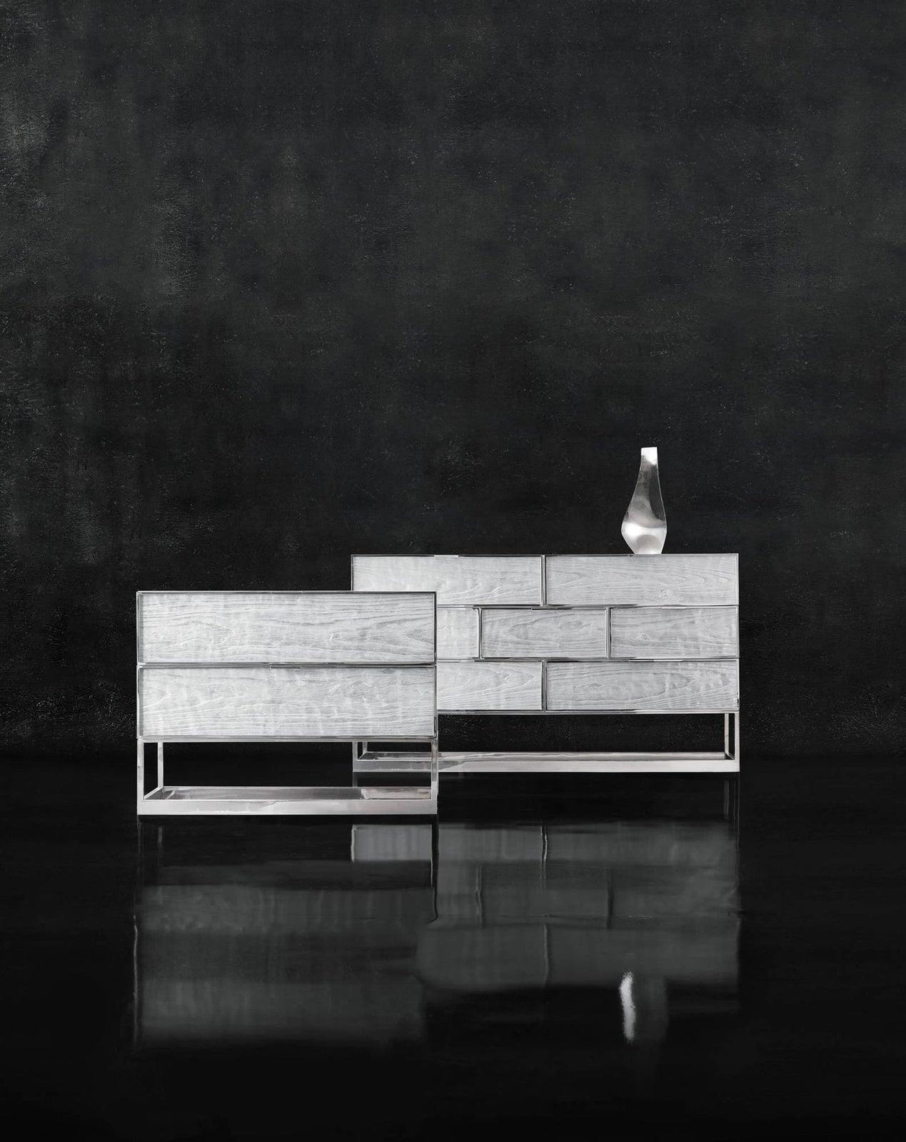Chapas de arce con acabado lacado blanco de alto brillo . El acero inoxidable pulido rodea la bancada y forma la base. Los cajones presentan frentes de acrílico con un diseño que imita la veta de la madera y un reverso de pan de plata que les aporta una profundidad luminosa.