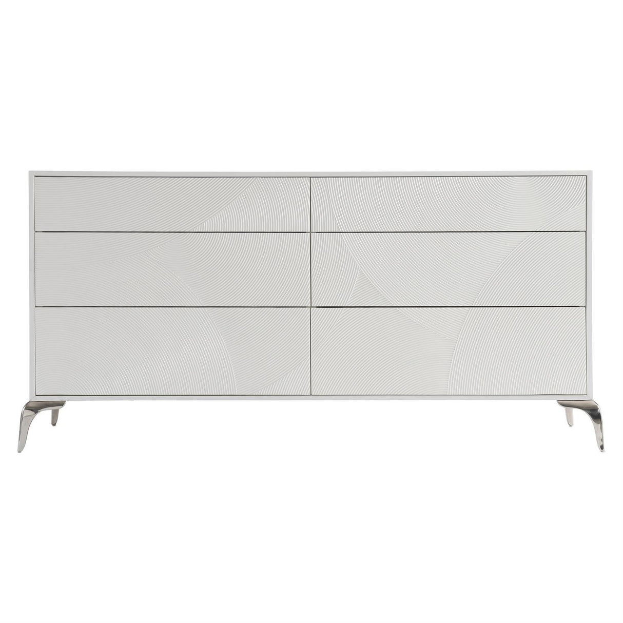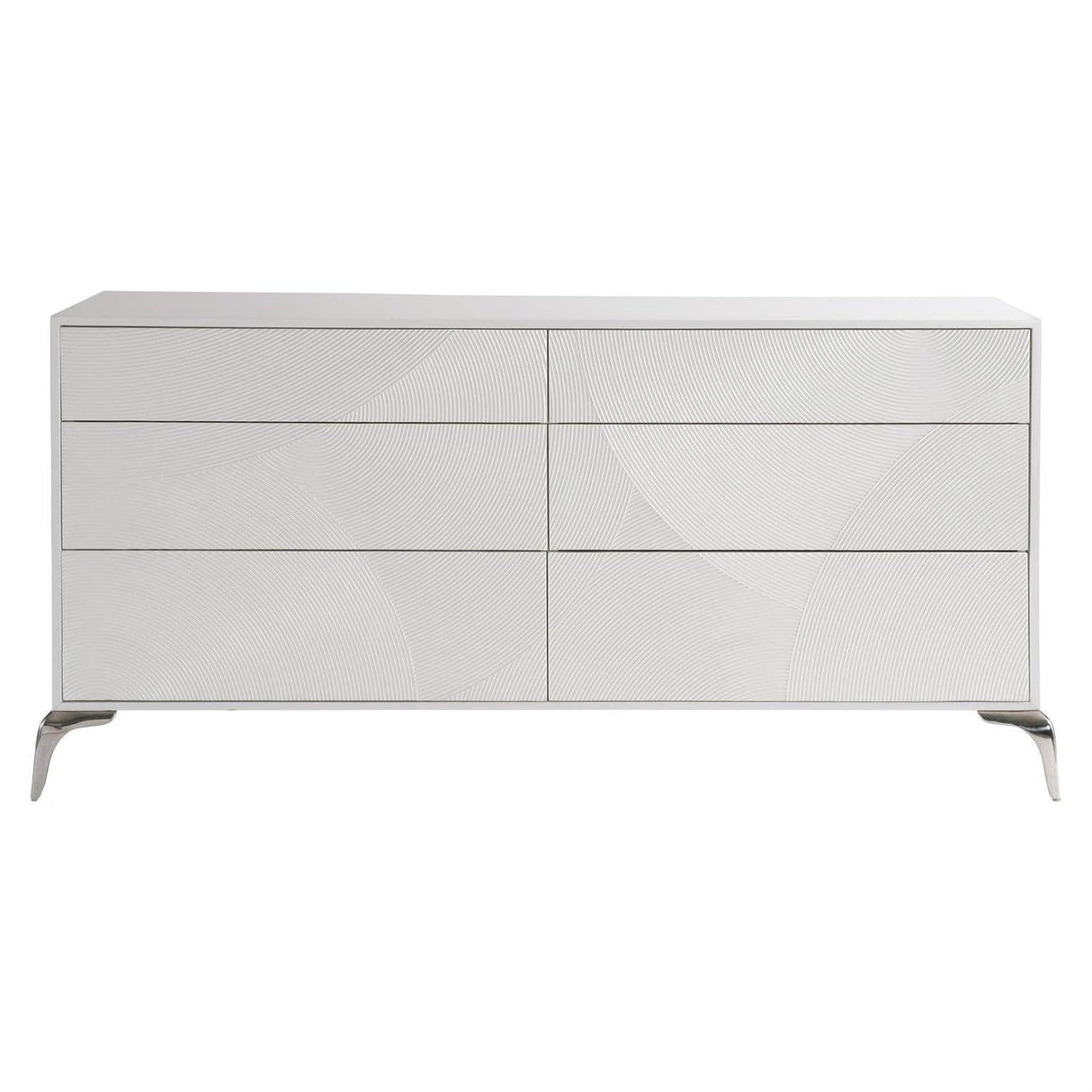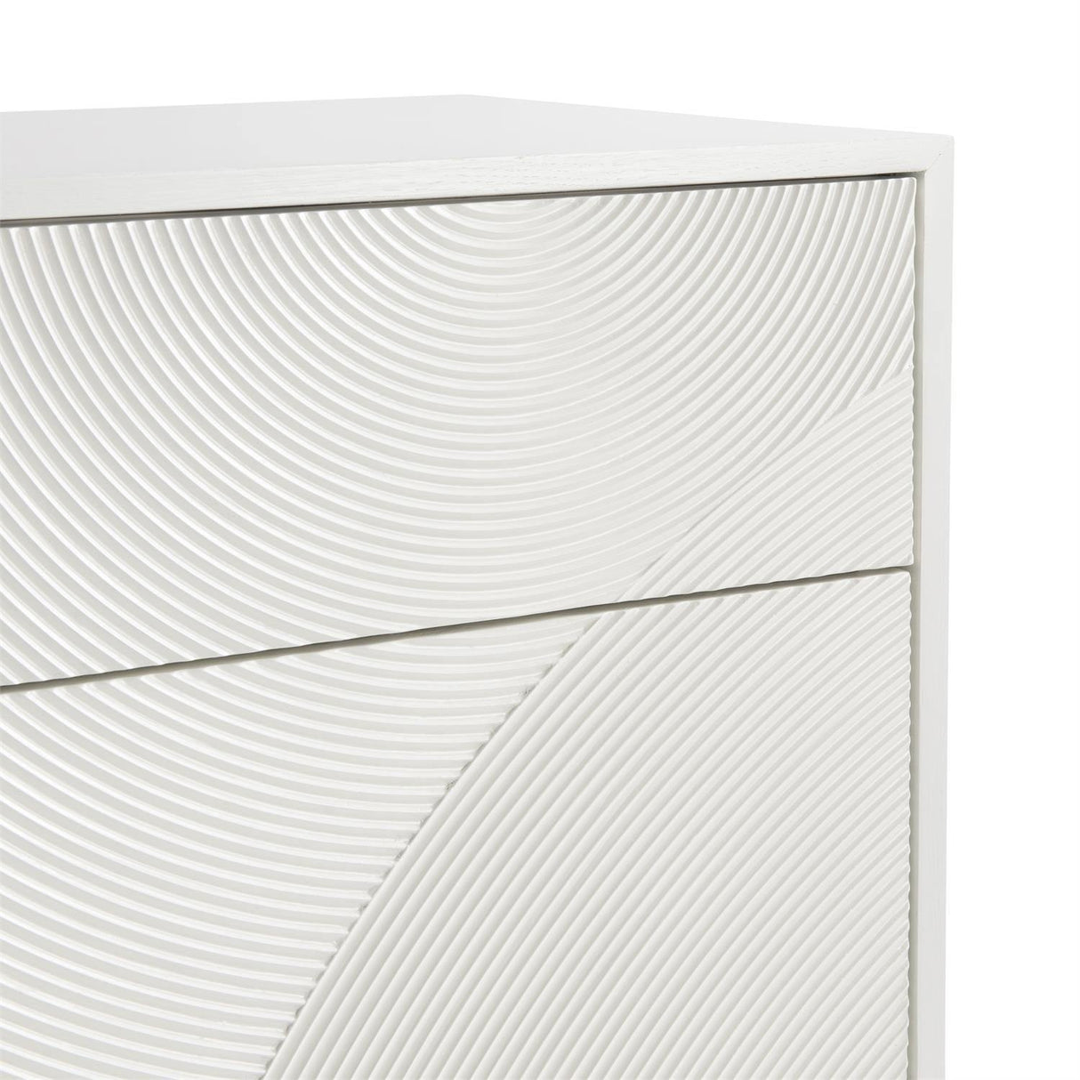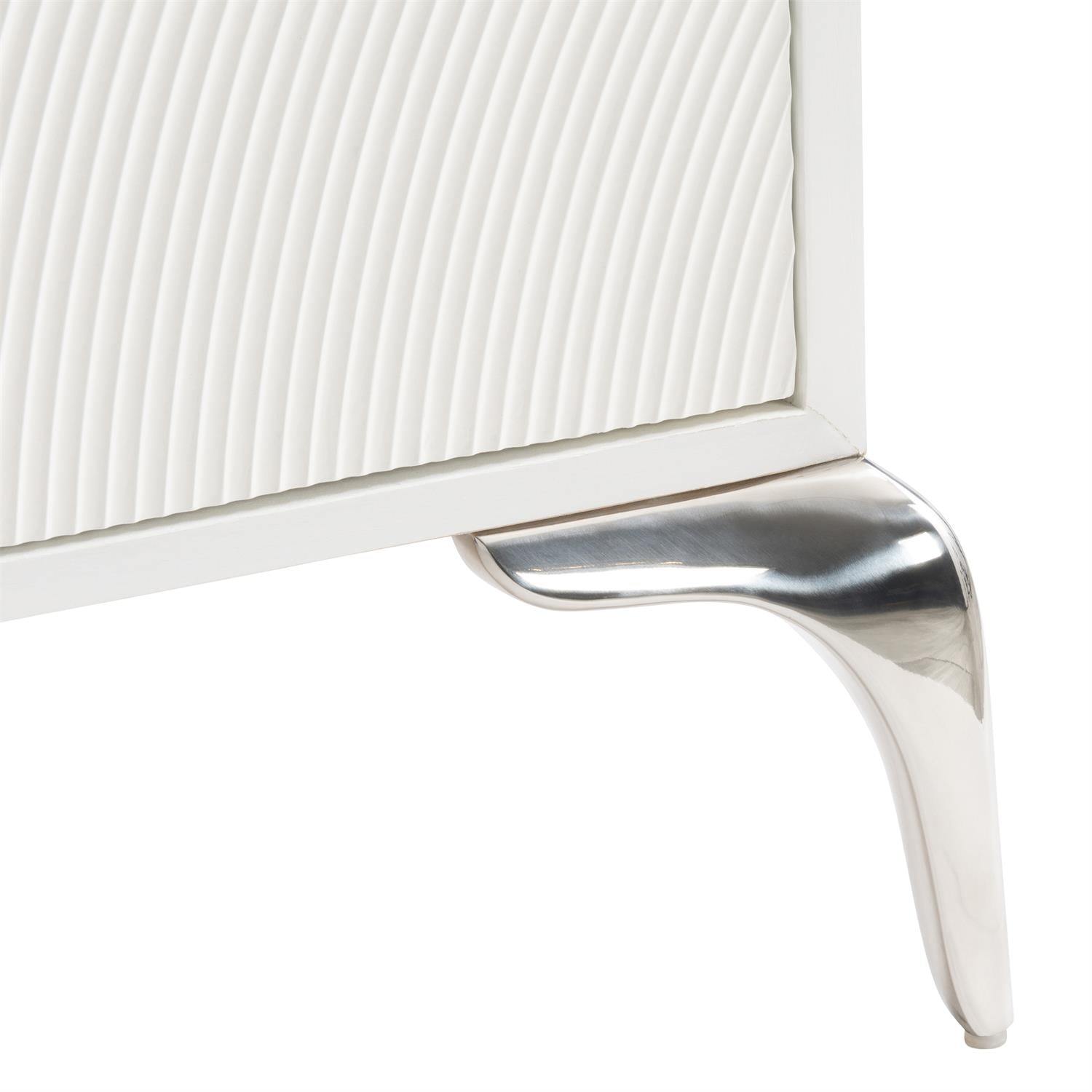 - Las formas texturizadas y un acabado blanco glamoroso le dan a esta cómoda un aspecto propio.