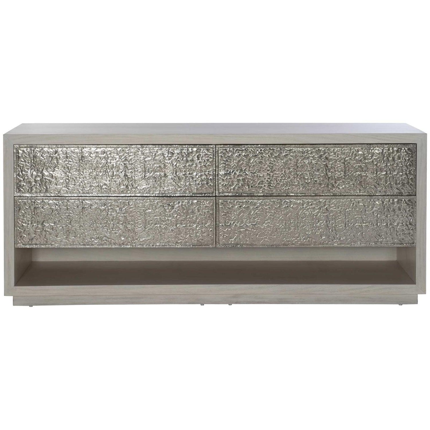 La cómoda Bernhardt Interiors Ware de 4 cajones en nogal Pika con frentes de aluminio fundido ofrece una sofisticación rústica y moderna con una innovadora combinación de materiales. Con cuatro cajones de aluminio fundido texturizado con apertura a presión, una elegante base de zócalo y un compartimento inferior abierto, esta cómoda ofrece espacio de almacenamiento y exhibición. Envío nacional gratuito + Entrega en guante blanco incluida sin costo adicional.