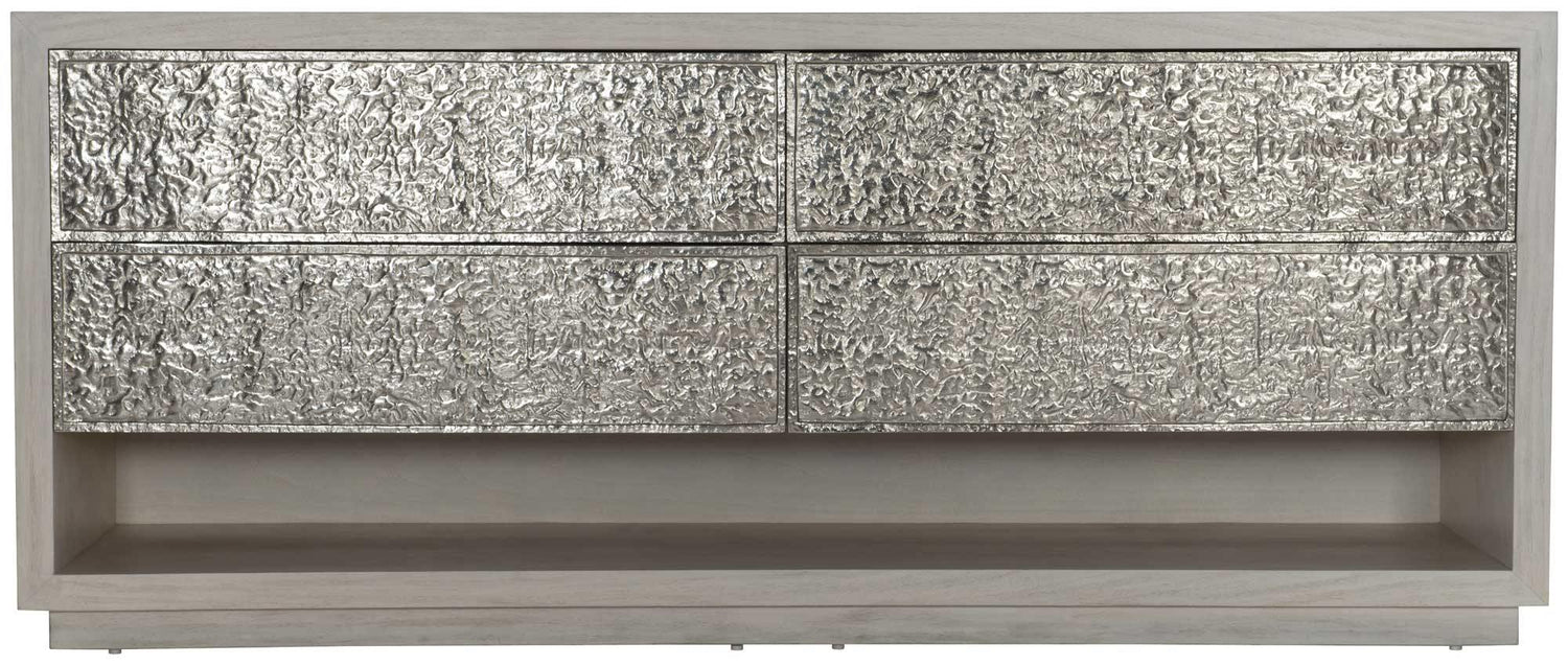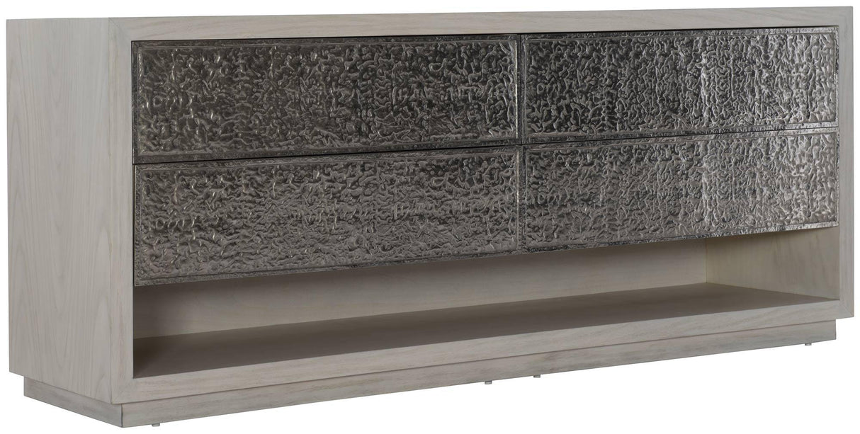 La cómoda Bernhardt Interiors Ware es una audaz combinación de madera y metal, que combina forma y funcionalidad. Con frentes de cajones de aluminio fundido texturizado, marco de nogal y un versátil compartimento abierto, es una pieza destacada para interiores rústicos y modernos.