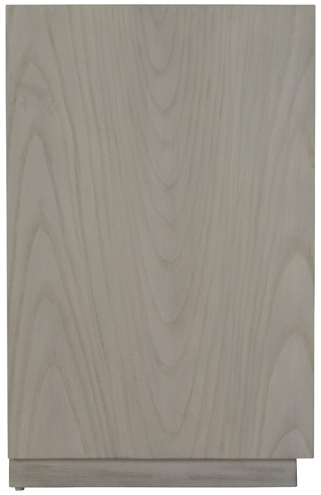 Fabricado con chapas de nogal veteado con acabado Pika y frentes de cajones de aluminio fundido texturizado. Se apoya sobre una base de zócalo con un compartimento abierto integrado para almacenamiento y exhibición.