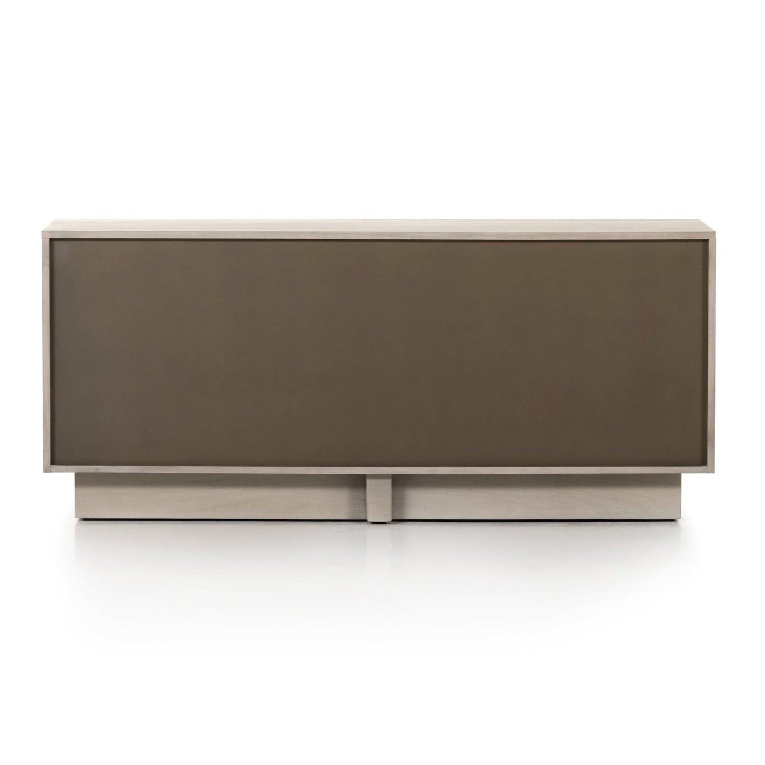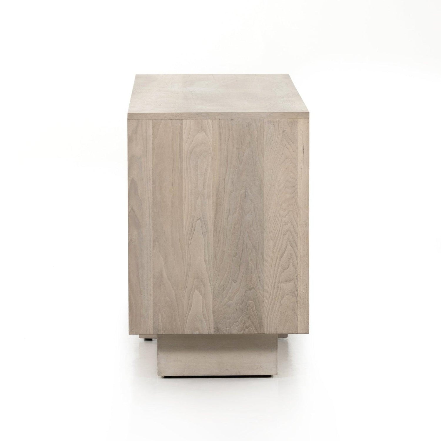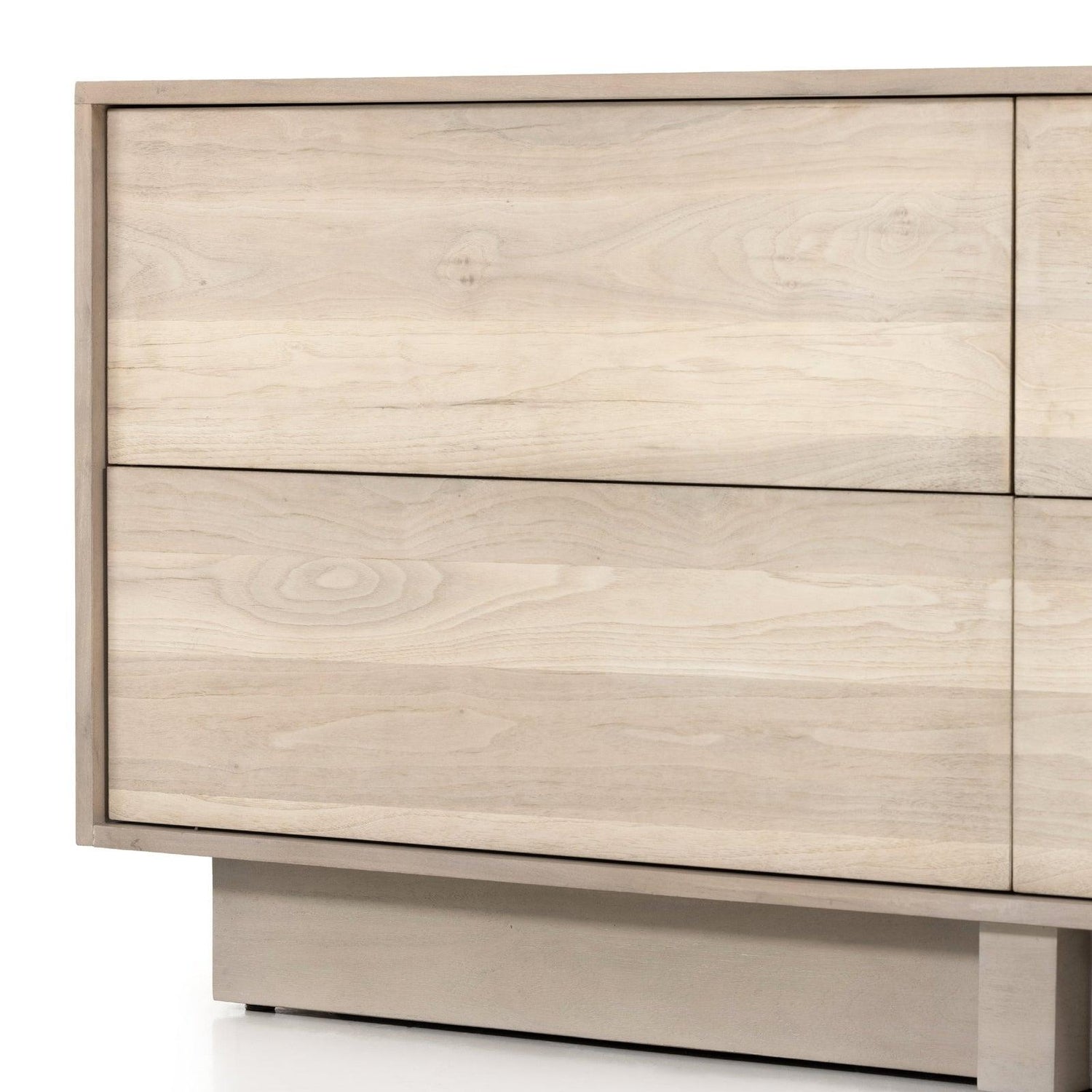 - Una base de zócalo empotrada en forma de T de caoba con acabado gris sostiene una cómoda de cuatro cajones de corte impecable enchapada en nogal ceniciento, con herrajes de cierre a presión ocultos.
