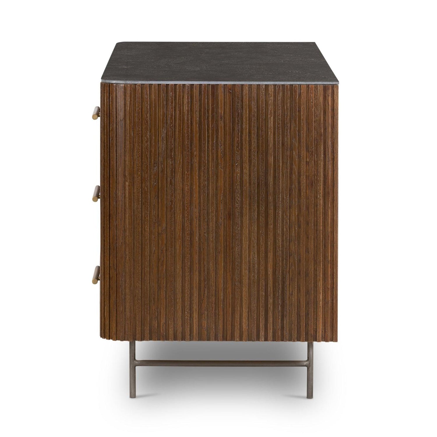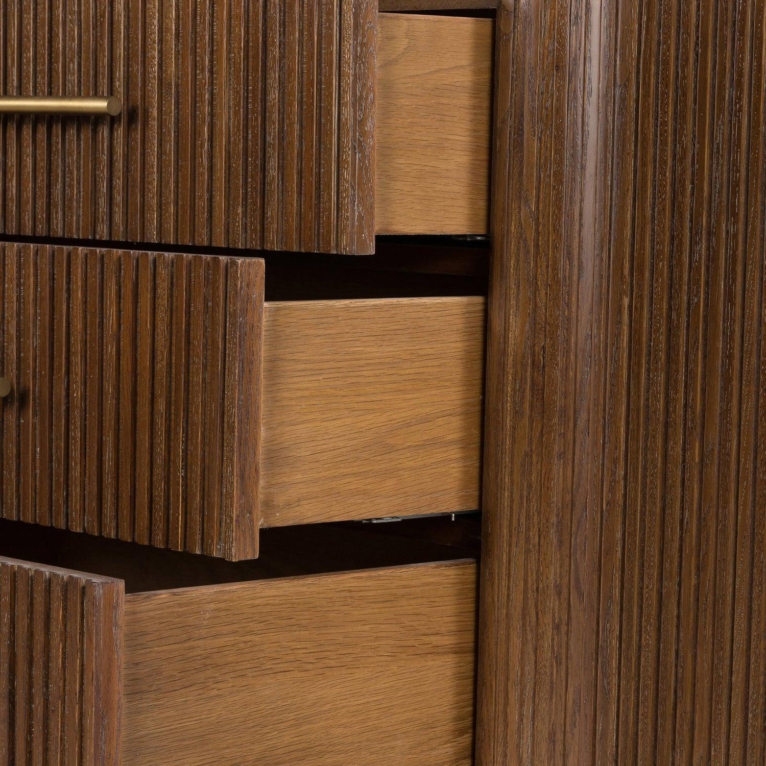 • Rico en lengüetas para una gran textura y una apariencia lineal, el roble macizo con acabado marrón hace alarde de seis espaciosos cajones con herrajes de latón pulido y esquinas fríamente curvas, mientras que una cubierta de piedra azul aporta una hermosa combinación de materiales complementarios al almacenamiento del dormitorio.
