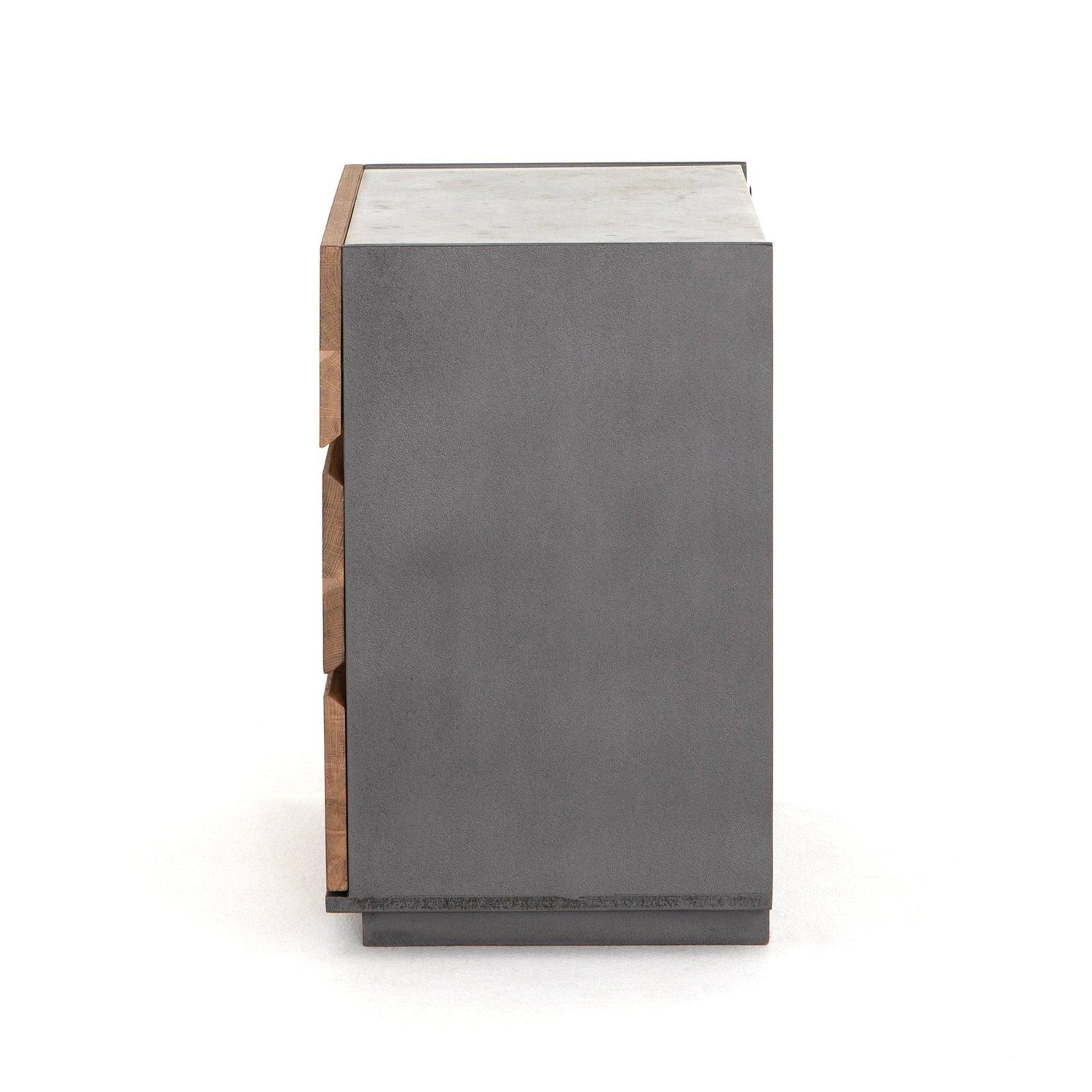 - La carcasa de madera dura lacada en gris alberga tres cajones de roble ahumado oscuro que ofrecen un amplio espacio de almacenamiento en el dormitorio.