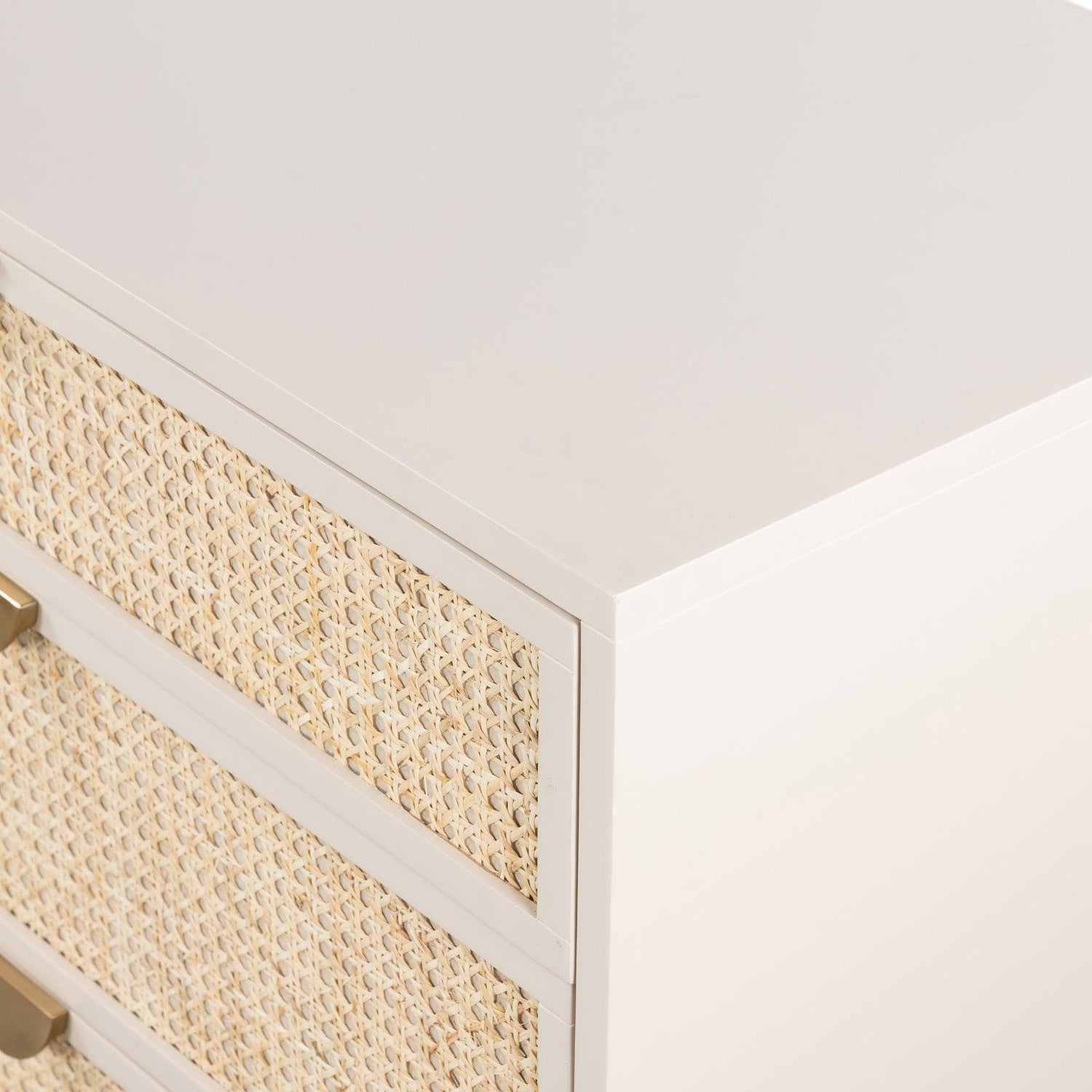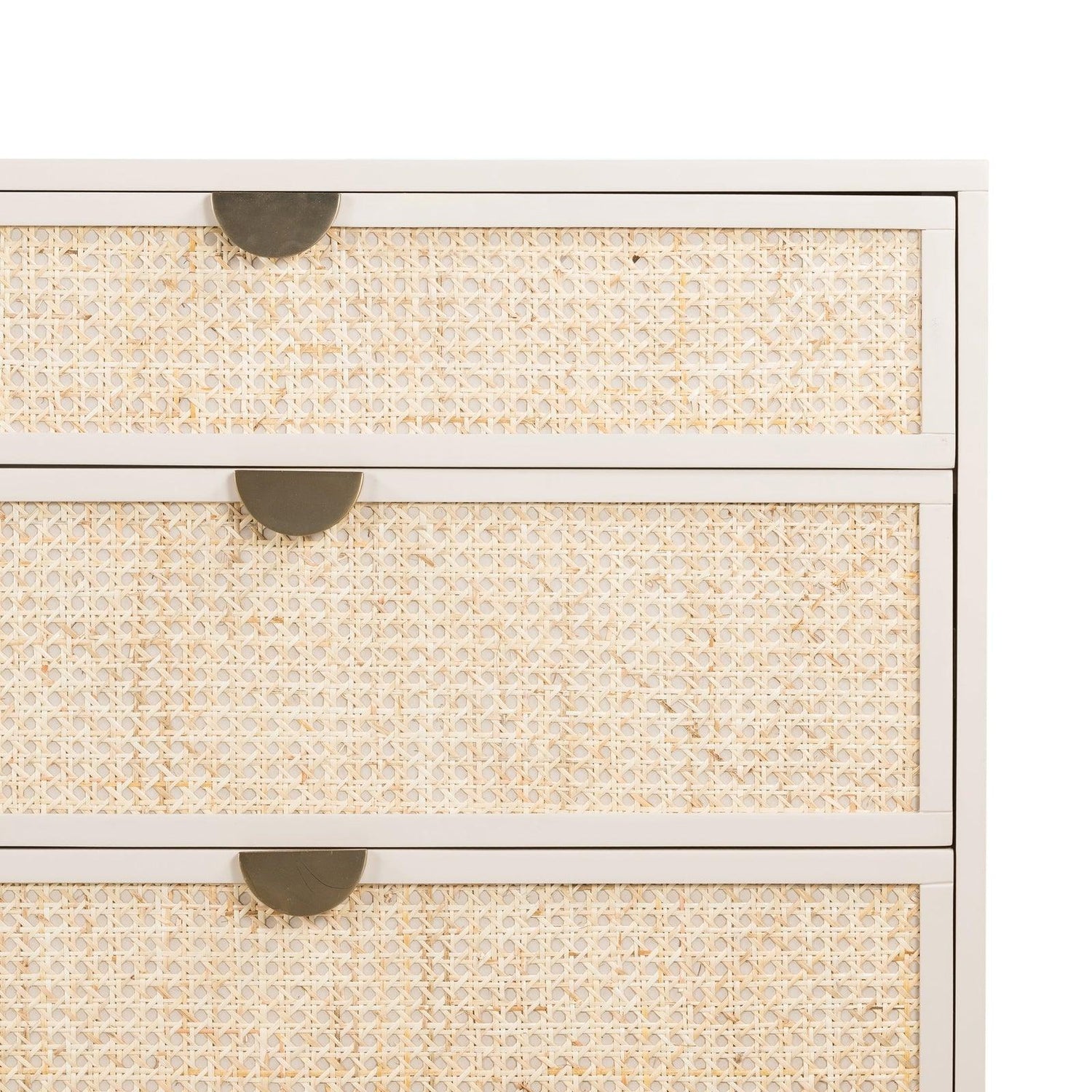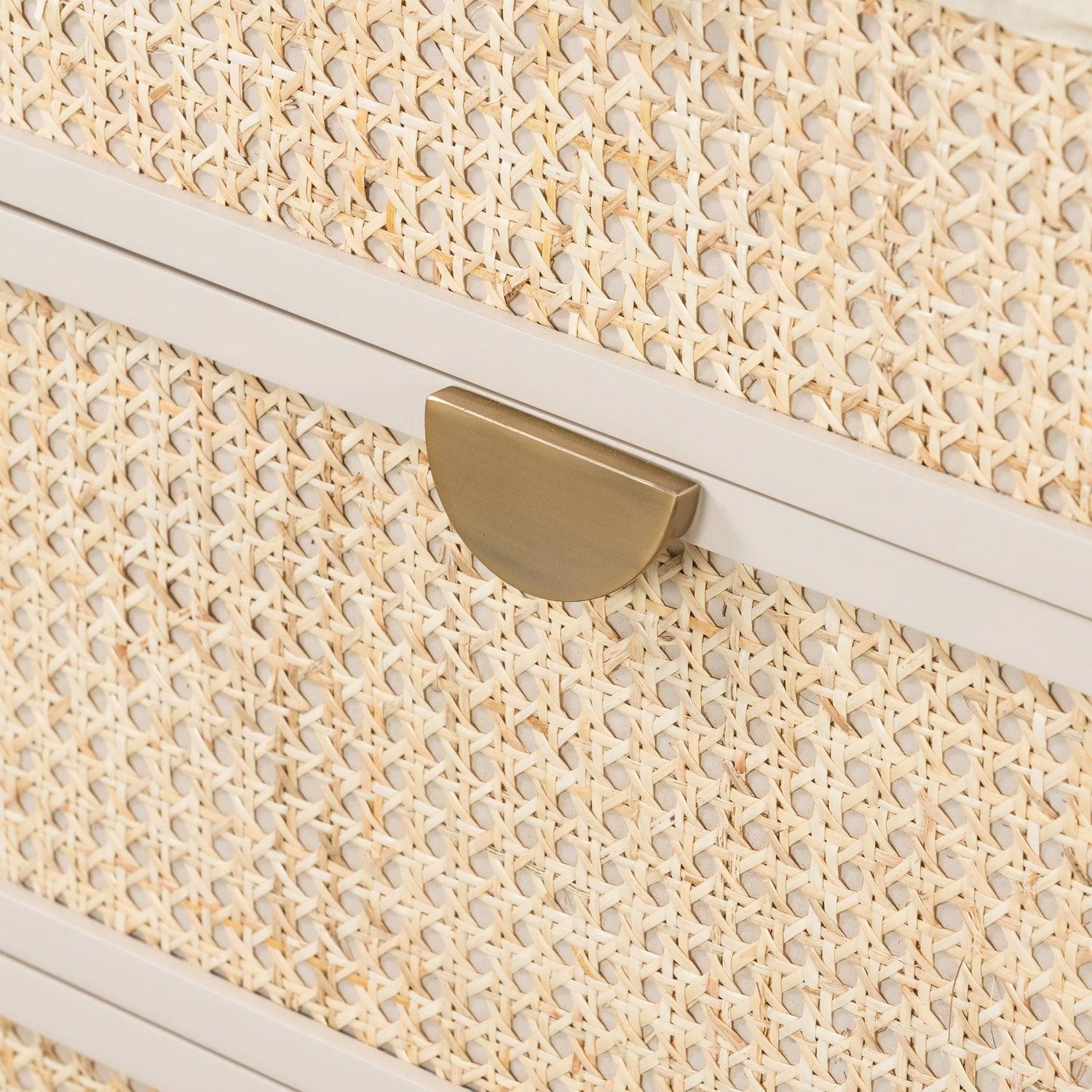 - Una cómoda lacada de seis cajones presenta paneles de caña tejida y herrajes en forma de media luna con acabado en latón envejecido.