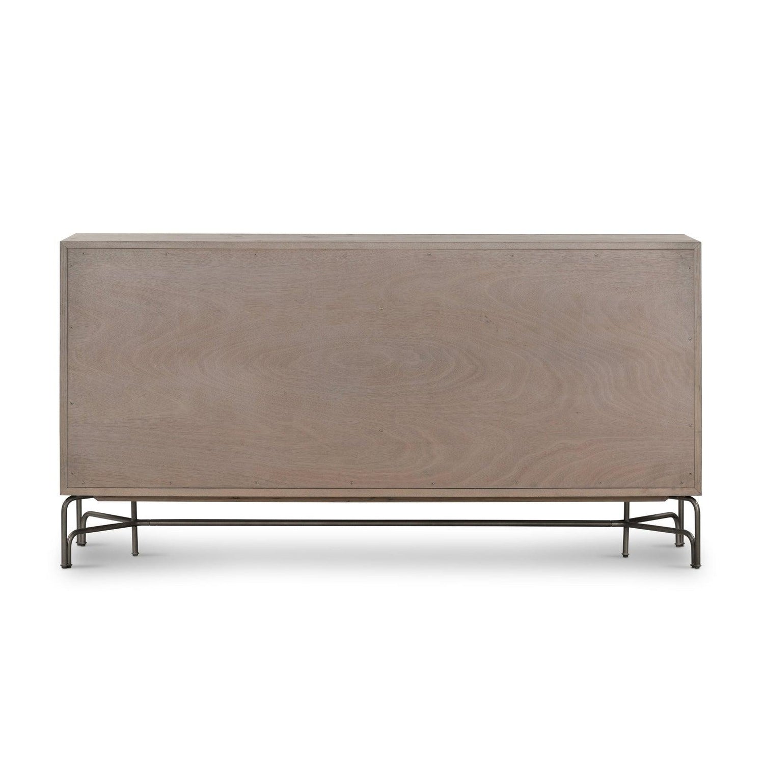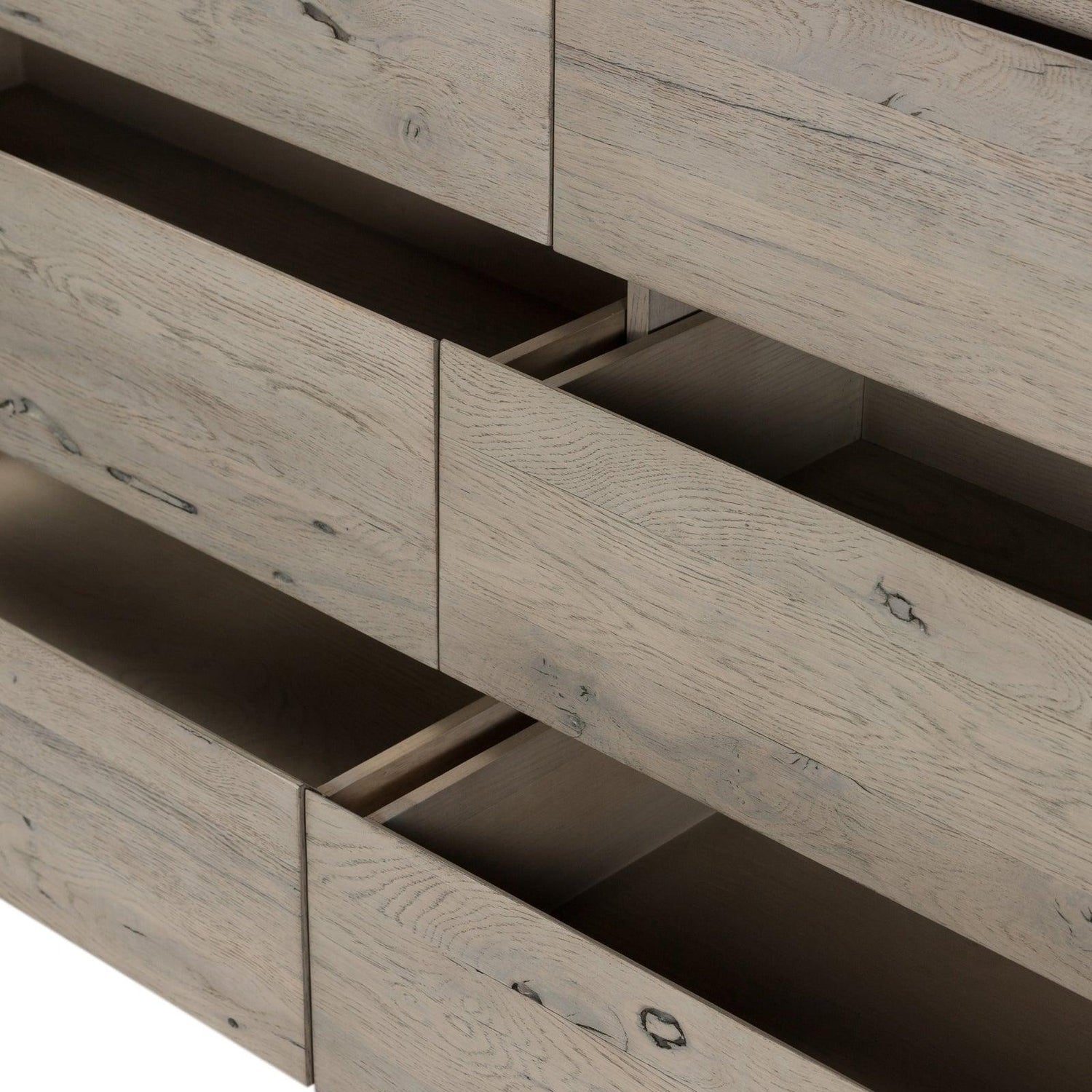 • Sobre una base de hierro tubular con acabado en bronce cepillado, una cómoda de dormitorio hecha de roble aserrado presenta seis cajones espaciosos, que aportan mucho espacio de almacenamiento al dormitorio.