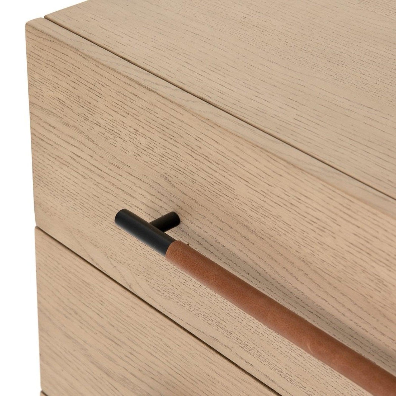 - El roble con acabado claro forma una silueta limpia para seis cajones espaciosos con herrajes de hierro envueltos en cuero de grano superior color tostado.
