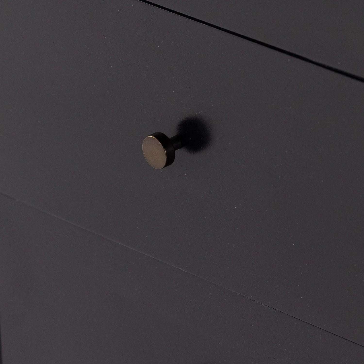 - Aporte un aspecto limpio y bellamente industrial al dormitorio con una espaciosa cómoda de cinco cajones hecha de hierro con acabado negro y herrajes de hierro bronceado.