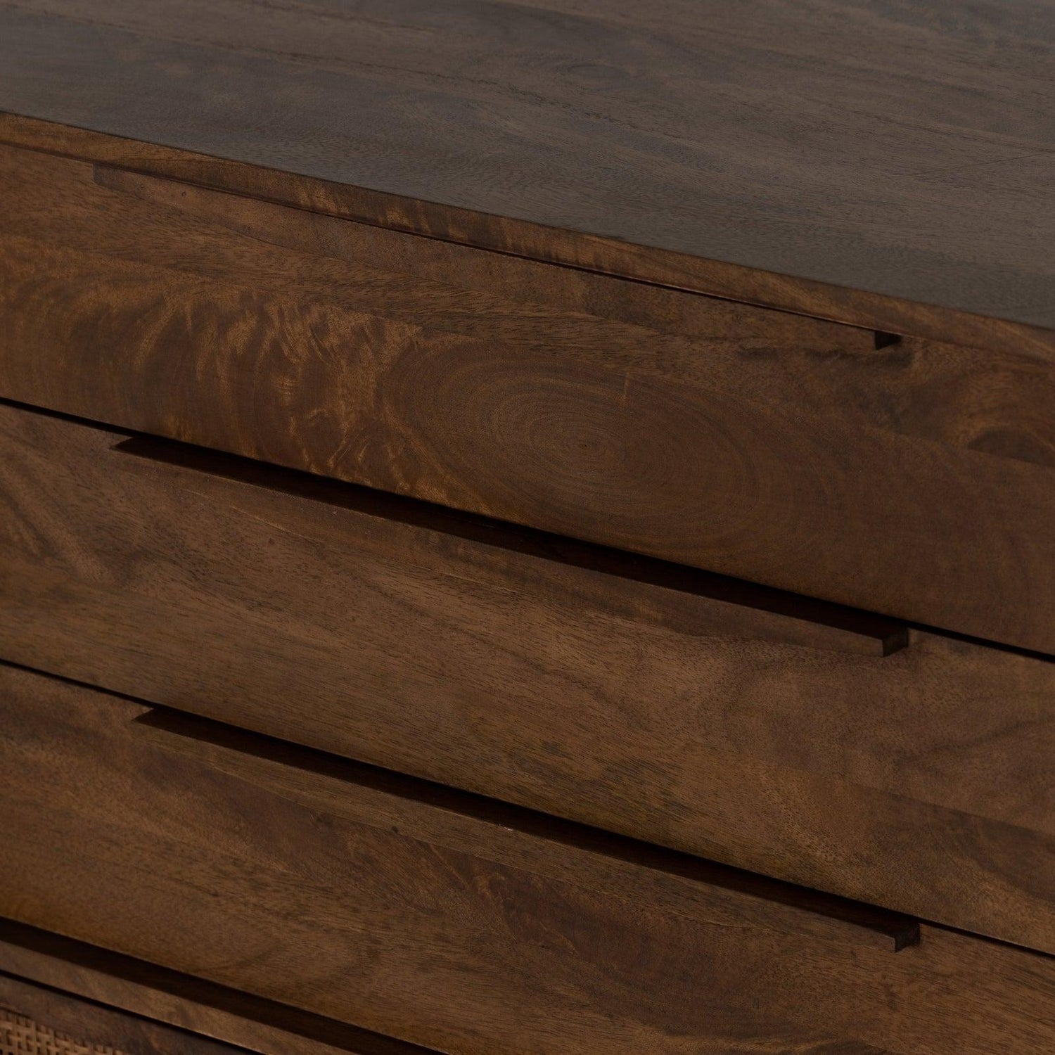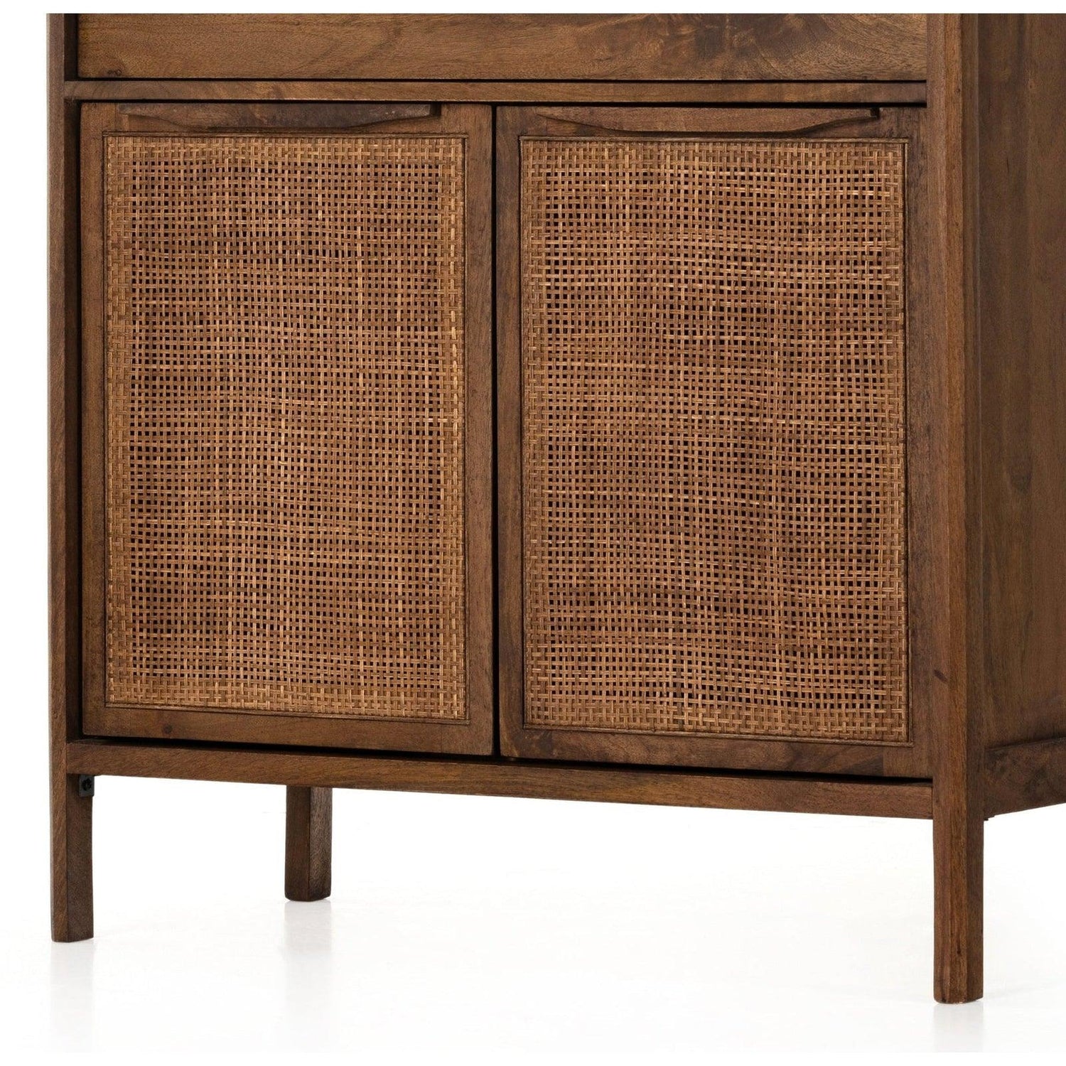 - La estructura de mango lavado en marrón presenta gabinetes frontales de caña tejida, para una apariencia liviana y texturizada con vibraciones monocromáticas.