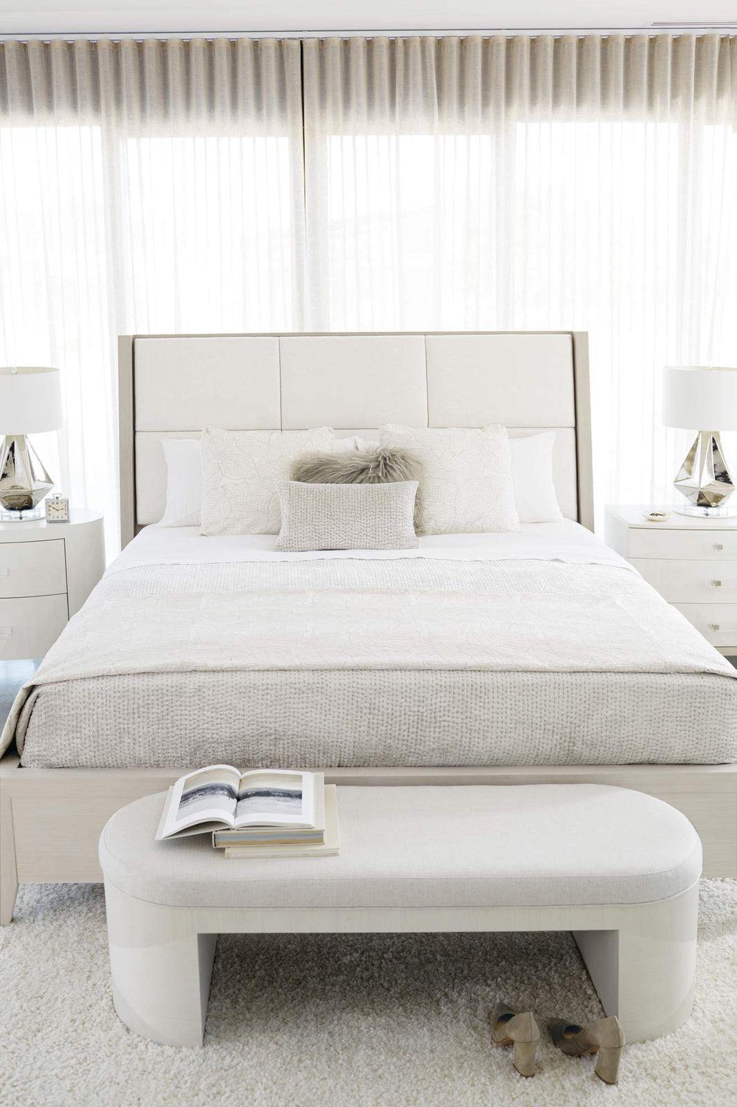 La mesita de noche compacta Axiom de Bernhardt combina el glamour moderno con un estilo transicional en un perfil más pequeño de 66 cm . Fabricada con madera maciza de álamo y chapa de imitación anigre, esta mesita de noche luce un acabado en blanco lineal con un frente suavemente curvado y un diseño de cajón en pirámide invertida . El acrílico transparente y los herrajes metálicos aportan un toque luminoso, mientras que la base y las patas en gris lineal aportan contraste y equilibrio.