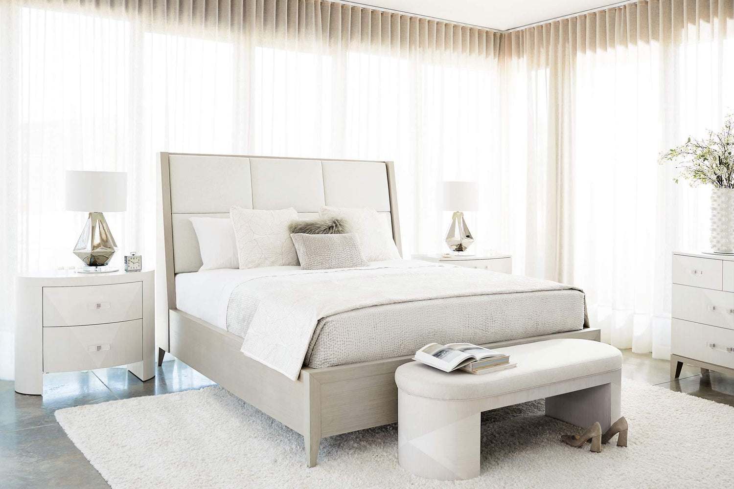 La mesita de noche Axiom de Bernhardt combina la elegancia de una época con materiales modernos. Con un acabado en blanco lineal sobre madera maciza de álamo y chapas de imitación anigre, su frente suavemente curvado y su diseño de pirámide invertida realzan sus tres amplios cajones. Los distintivos herrajes de acrílico y metal aportan un toque fresco y luminoso, mientras que la base y las patas en gris lineal realzan su elegante diseño.
