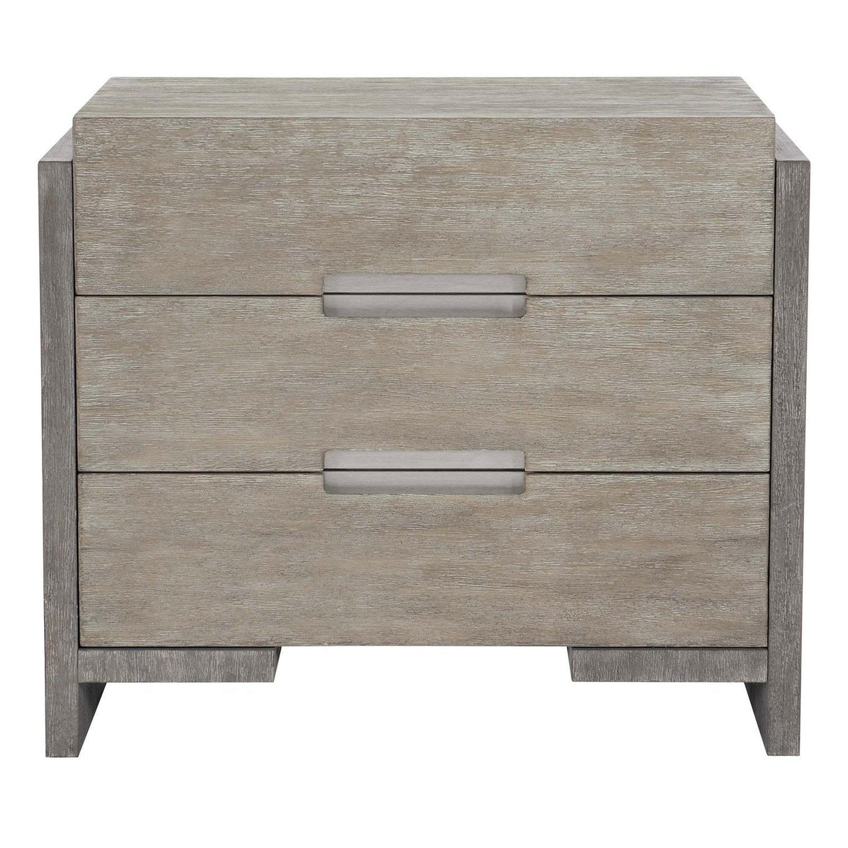La mesita de noche Foundations de tres cajones de Bernhardt ofrece una expresión refinada de diseño rústico moderno, combinando la calidez informal con la sofisticación minimalista. Elaborada en acacia cepillada y desbastada , esta pieza realza su textura con un acabado bicolor : cajones en pizarra clara combinados con paneles y rieles de soporte en pizarra oscura . Tres cajones de cierre suave ofrecen un amplio espacio de almacenamiento, mientras que un puerto de carga USB doble integrado garantiza la comodidad diaria. Los tiradores de acero inoxidable cepillado completan su diseño limpio y moderno.
