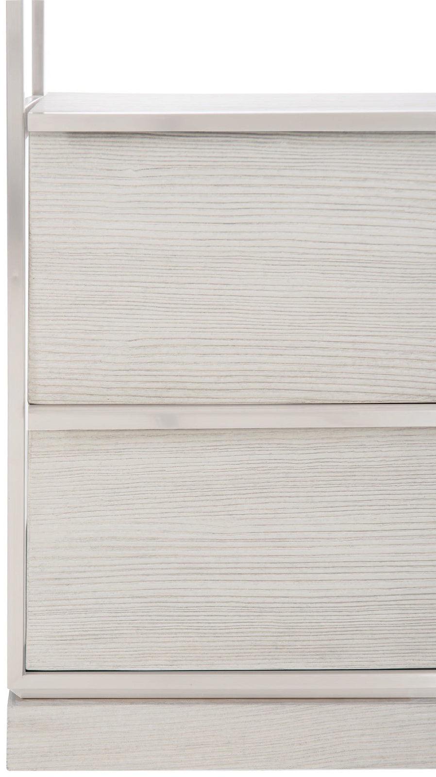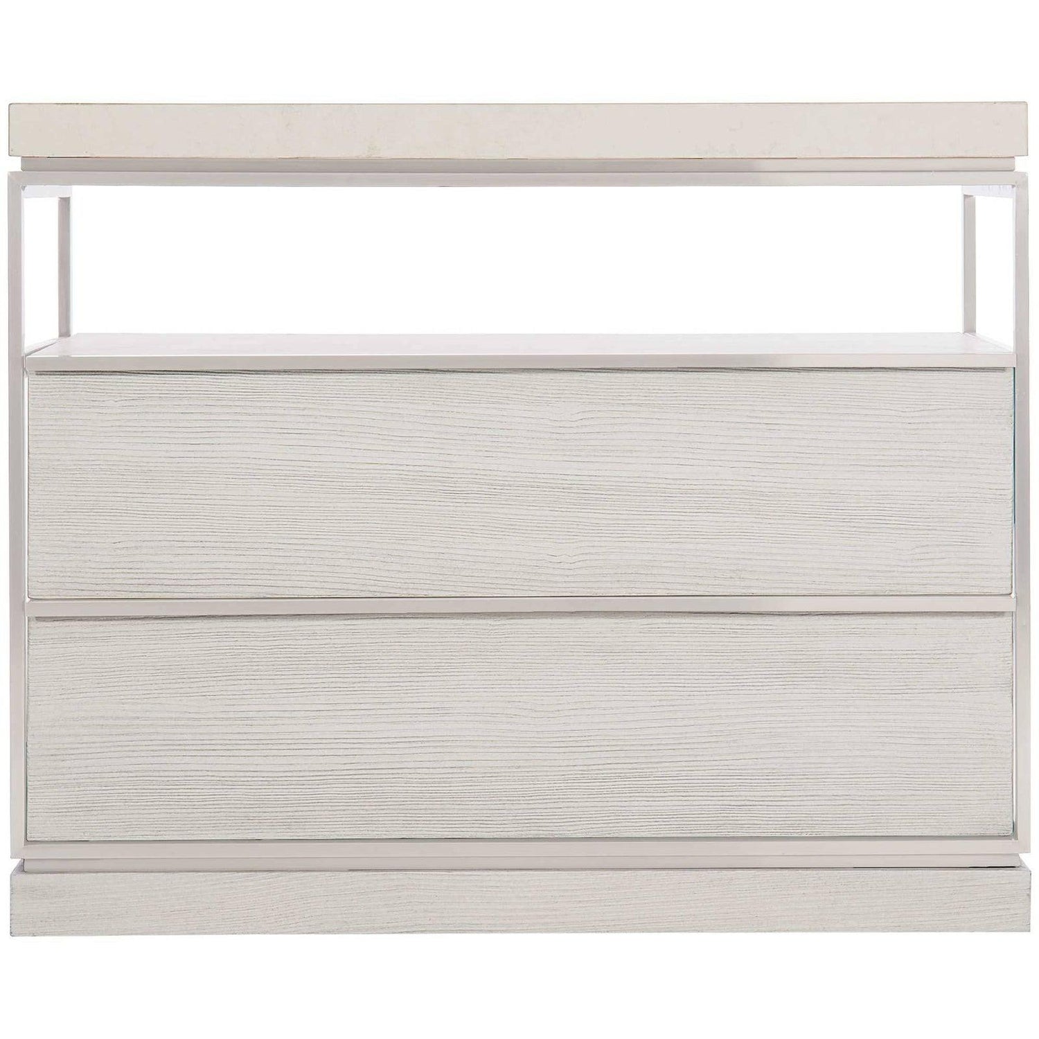 La mesita de noche Bryne de Bernhardt combina el minimalismo escandinavo con un diseño contemporáneo. Con una superficie de mármol blanco laminado , un acabado de madera de hueso sobre chapas de pino cepillado y una estructura de acero niquelado deslustrado, esta mesita de noche de líneas elegantes incluye dos cajones y un compartimento abierto para un almacenamiento versátil.