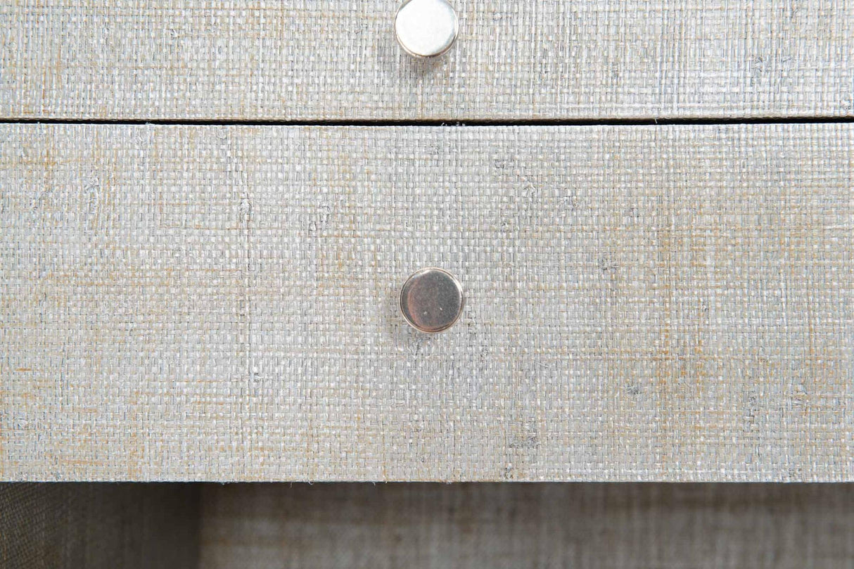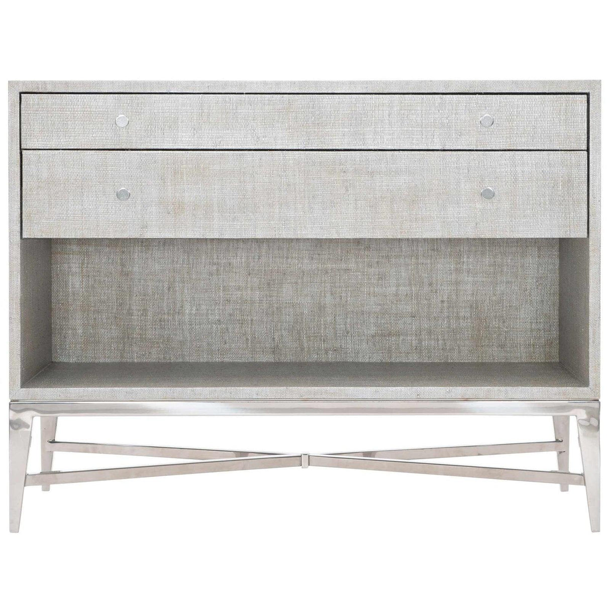- Debajo de los cajones hay un compartimento frontal abierto con un interior teñido de gris.