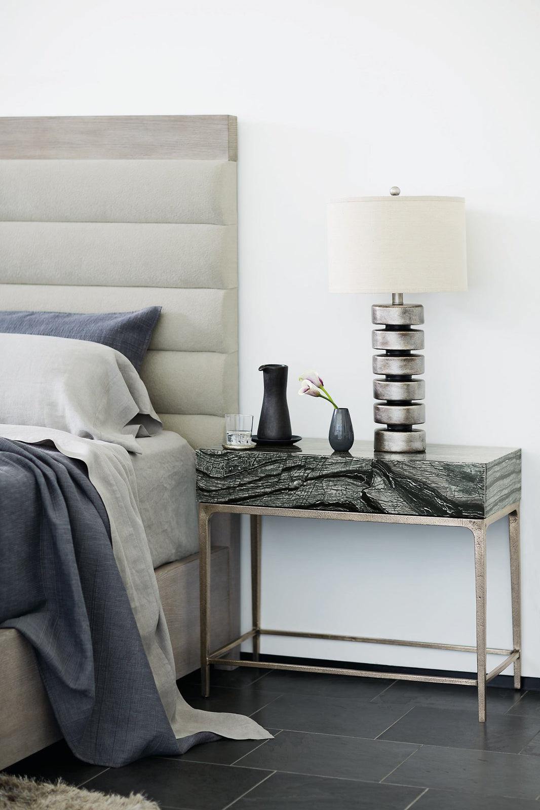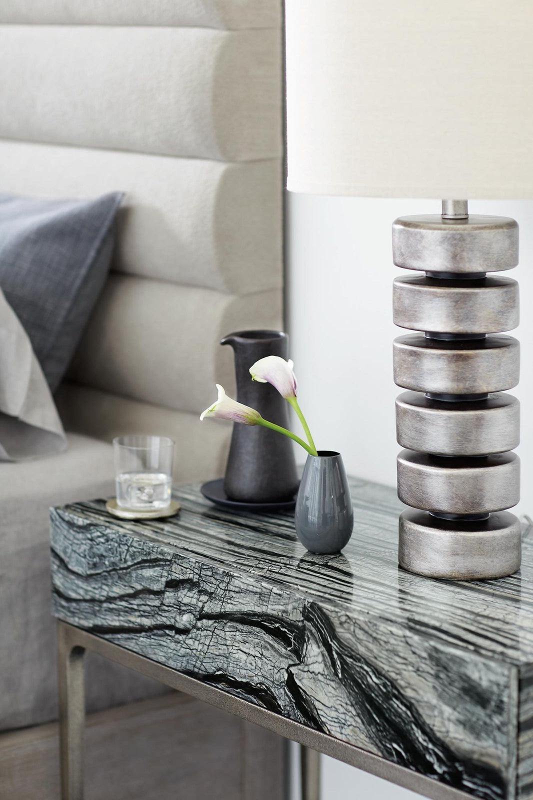 La mesita de noche Linea fusiona mármol natural con metal texturizado para lograr una apariencia refinada pero dramática: una opción ideal para dormitorios modernos que buscan una elegancia audaz.