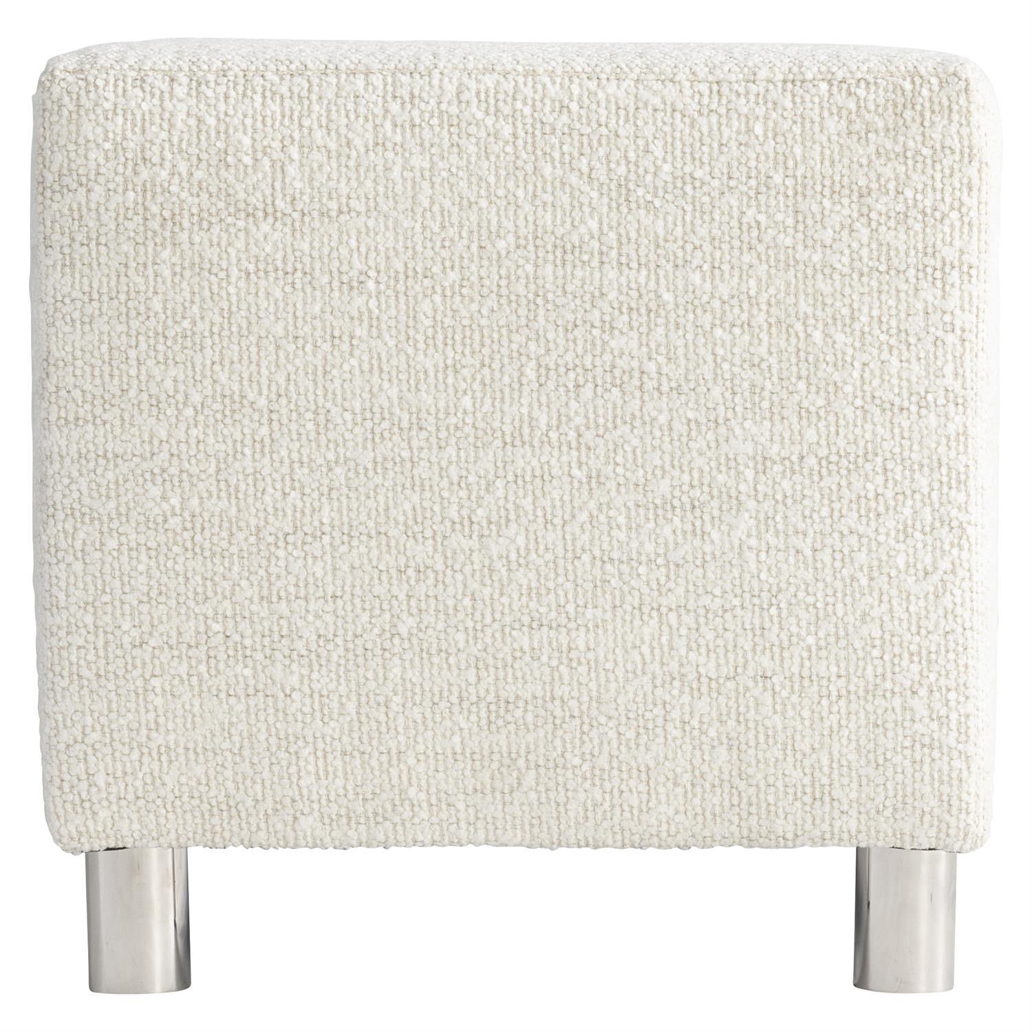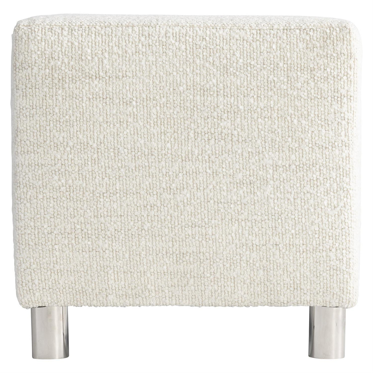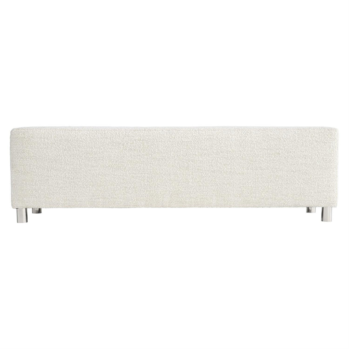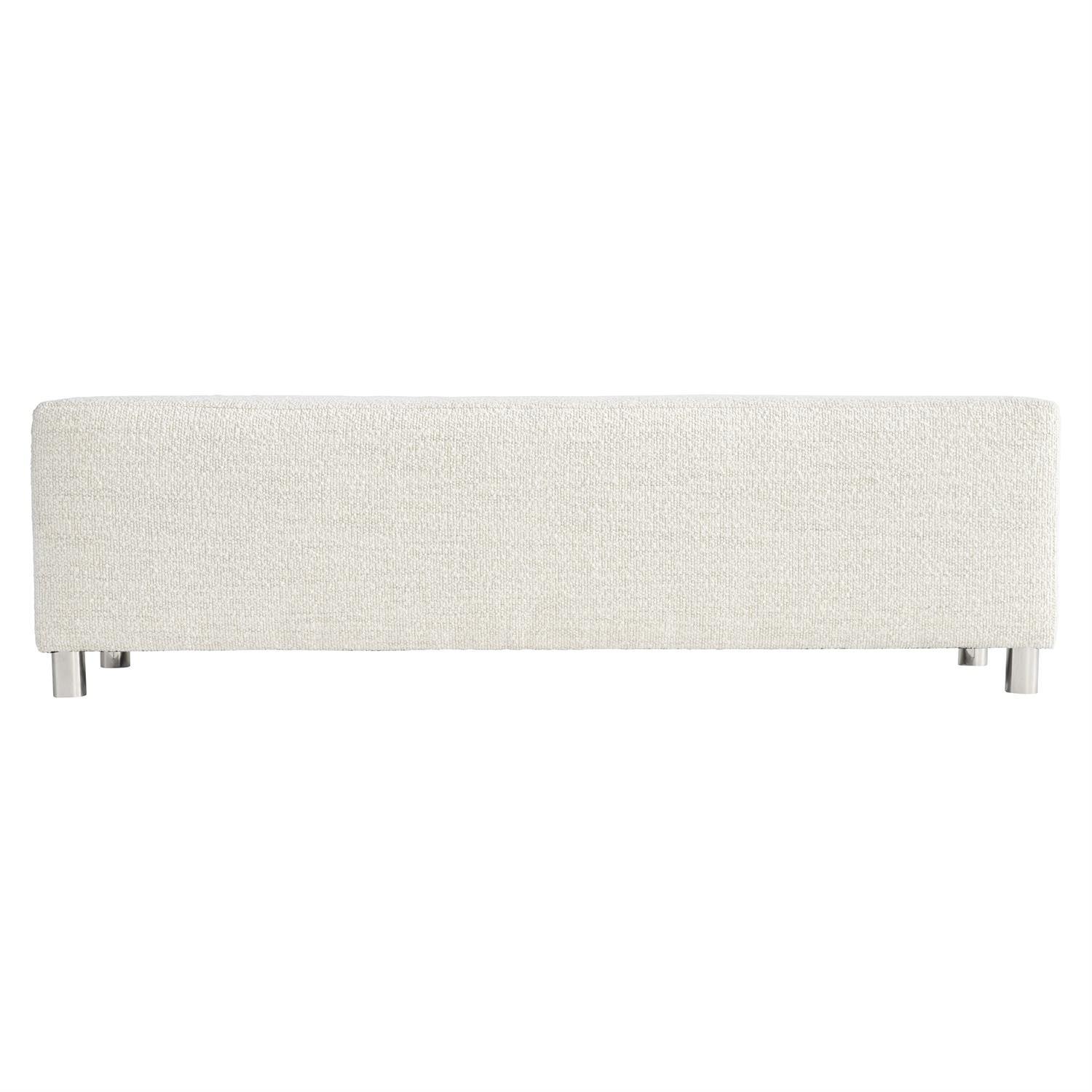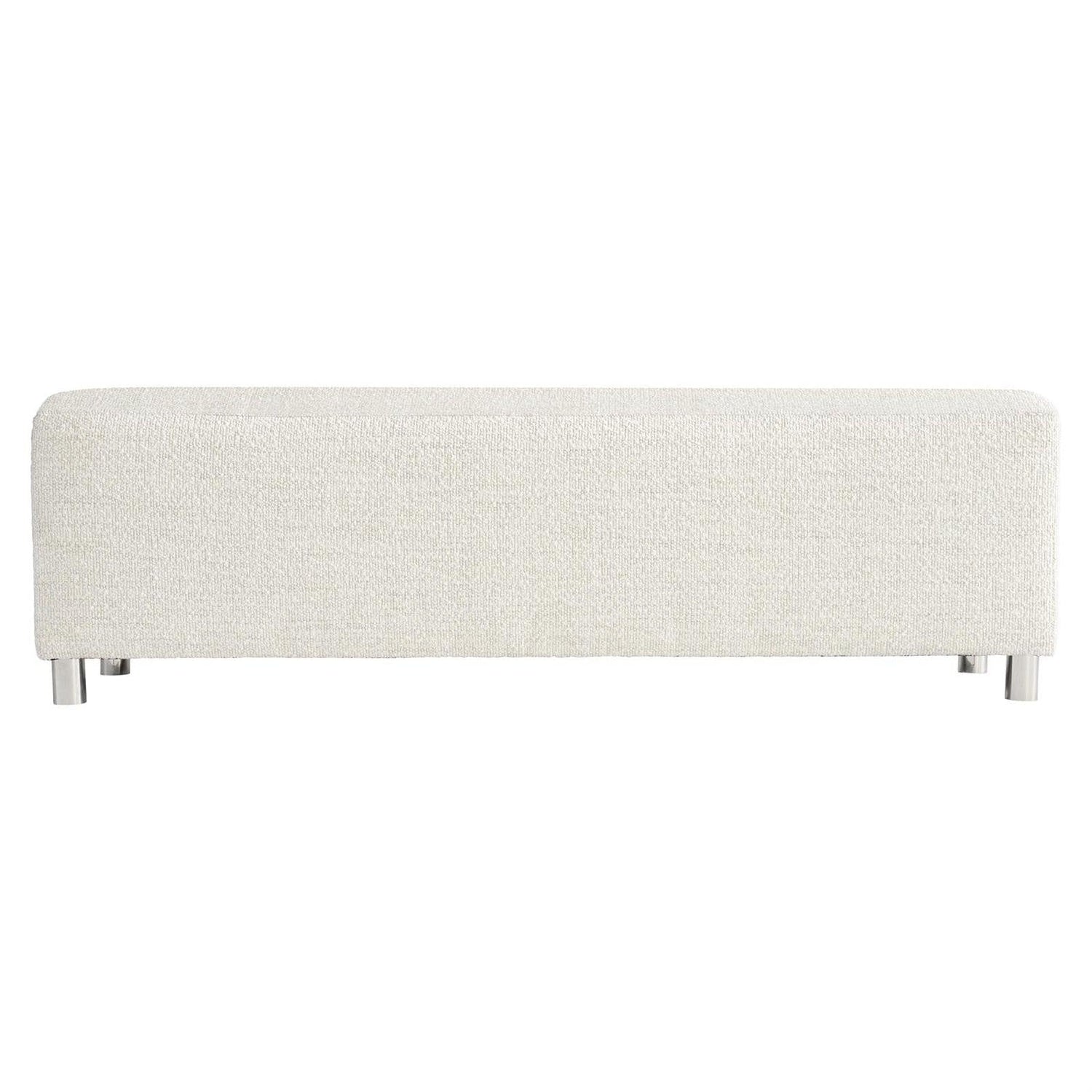 • Un banco tapizado con un estilo sencillo que se destaca por sus líneas limpias y patas de metal pulido.