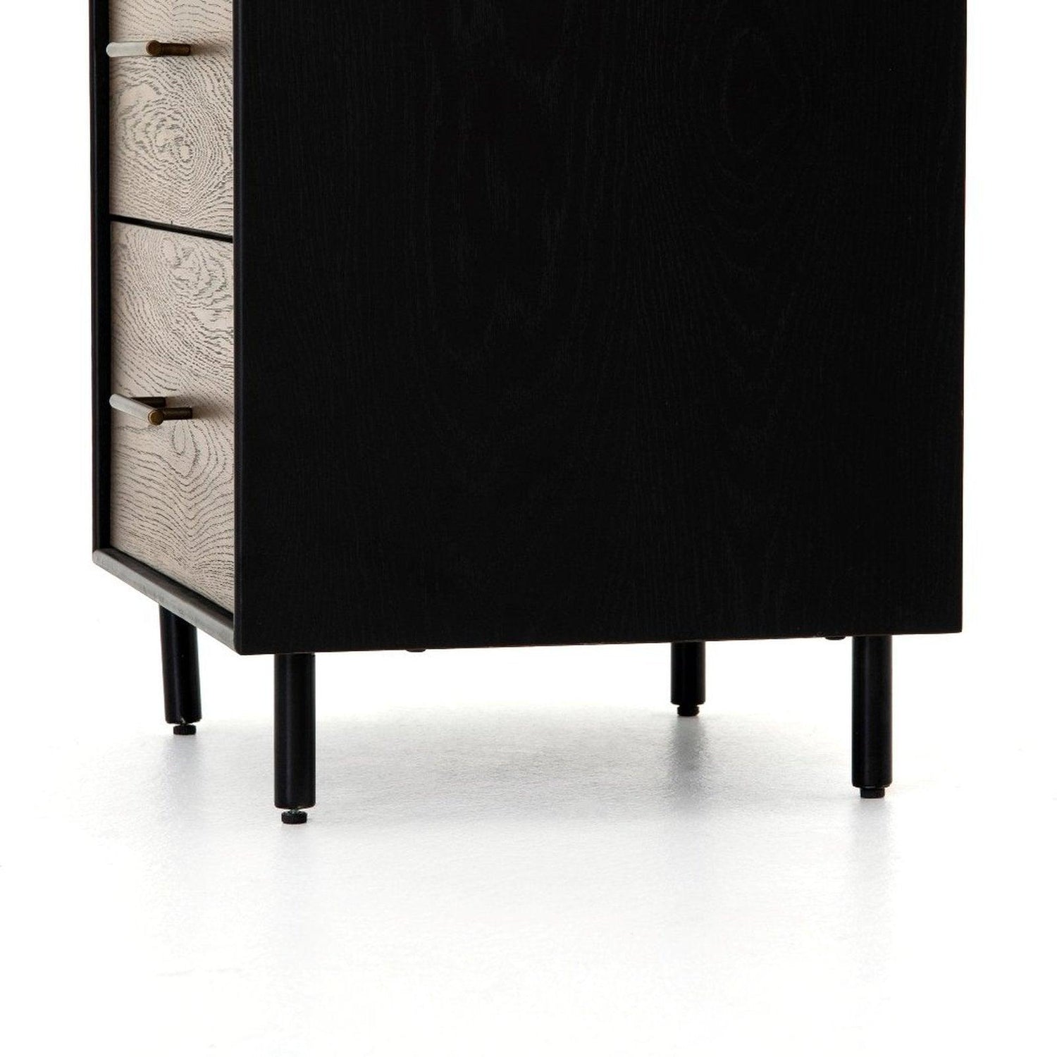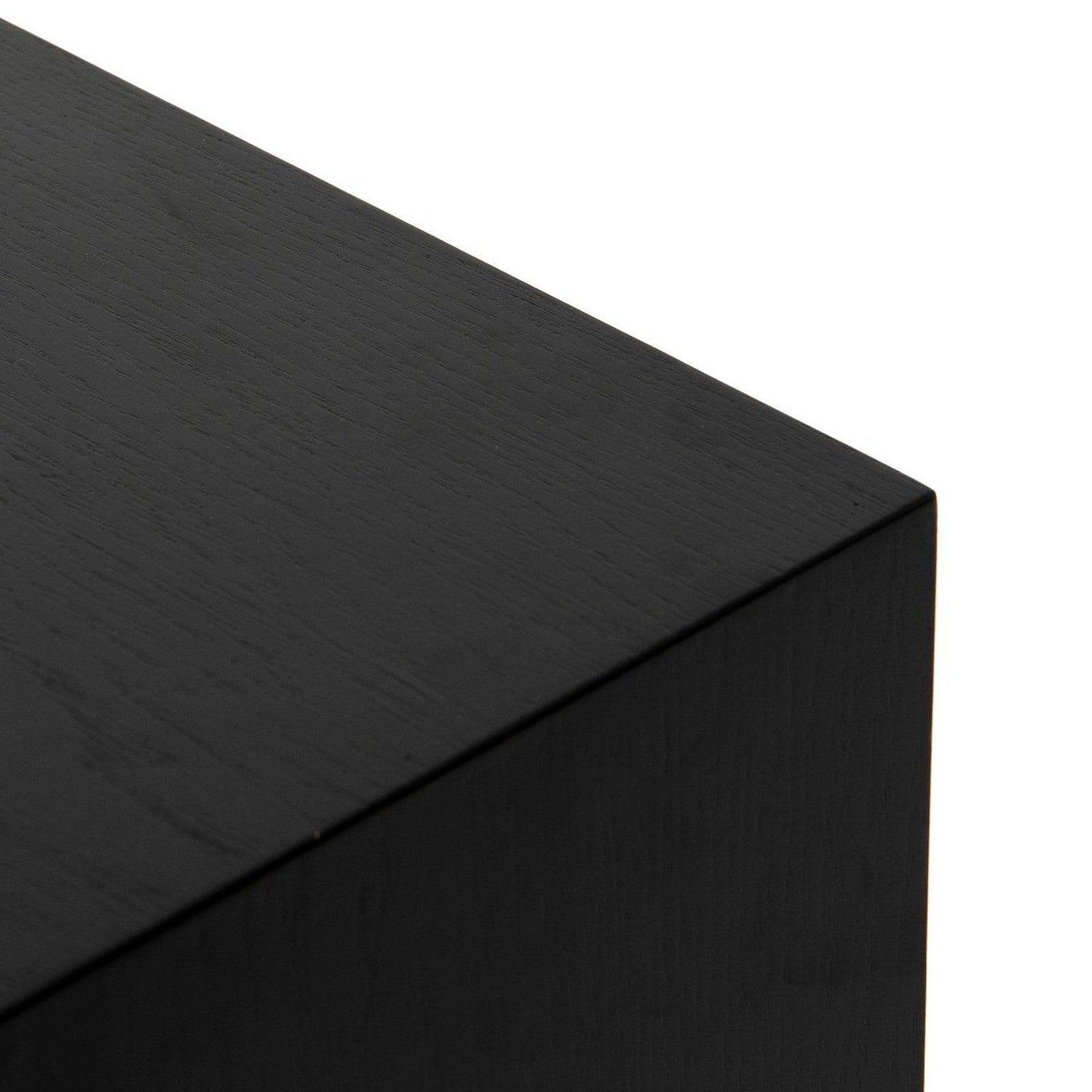 - La inspiración de mediados de siglo adopta una profundidad fresca a través de una carcasa de roble cepillado negro y cajones dobles insertados, que conservan las vetas naturales en forma de remolino del roble cálido para lograr un efecto textural.