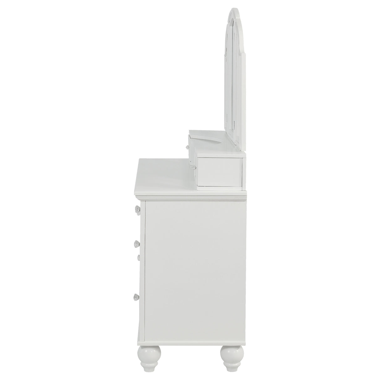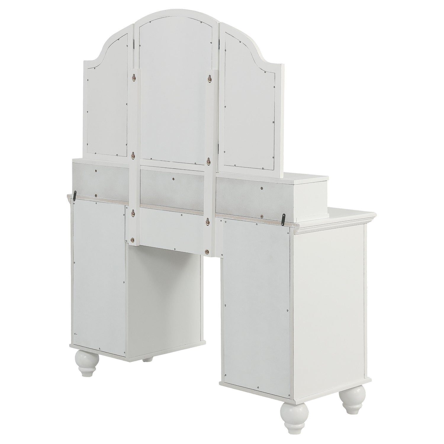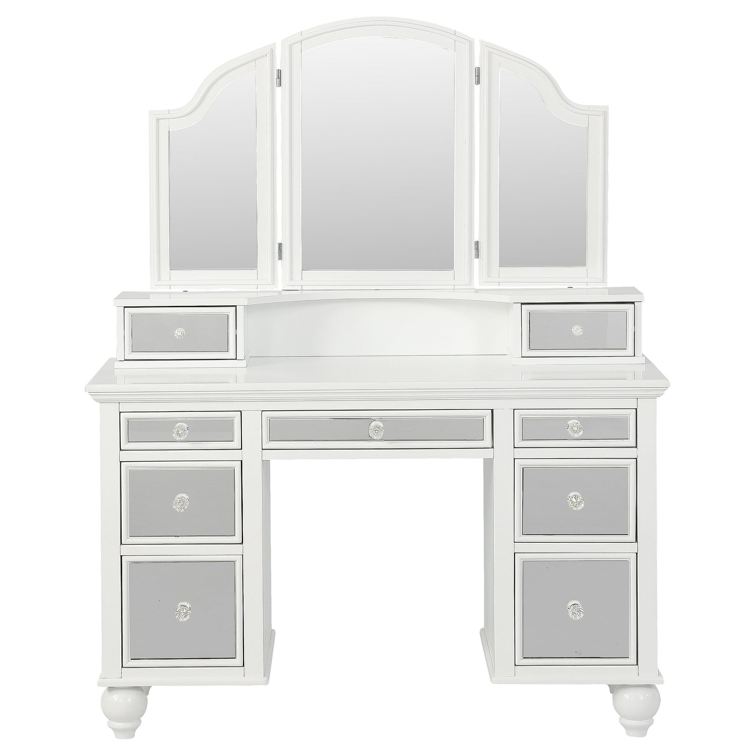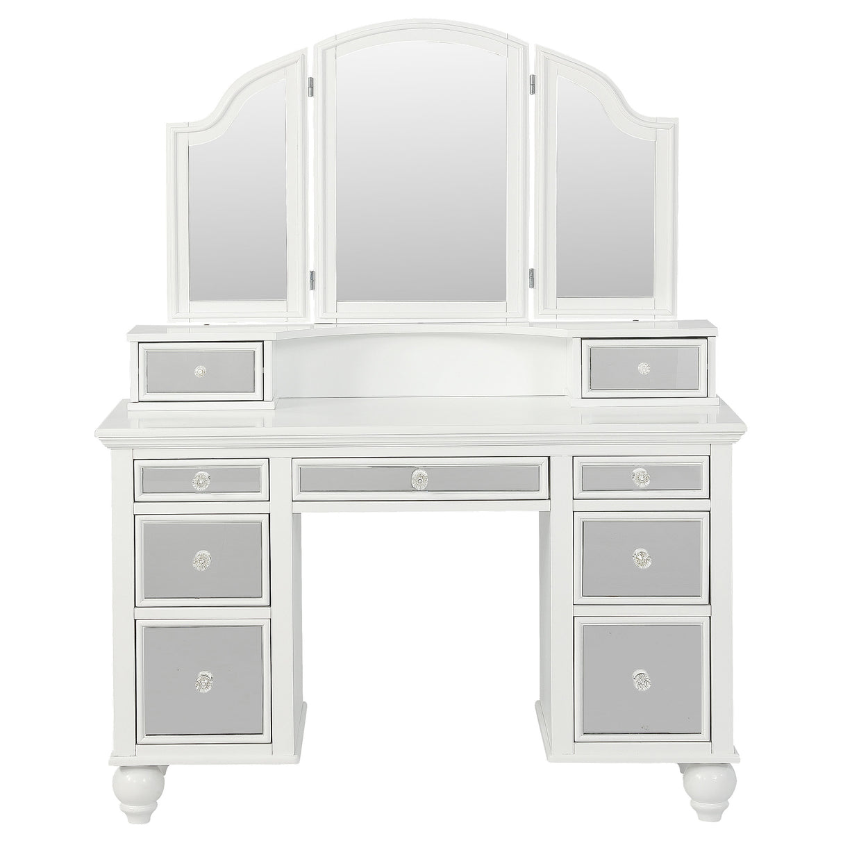 Lleno de glamour, este tocador de tres piezas es ideal para la fashionista en ciernes. Impecable y limpio, el escritorio presenta un acabado blanco brillante decorado con espejos reflectantes en sus nueve cajones. La clásica silueta del espejo de tocador se actualiza con elegantes curvas. Los cajones de dos niveles ofrecen el espacio perfecto para guardar frascos de perfume o brochas de maquillaje. Las patas redondeadas le confieren un aire sofisticado, complementado por las delicadas e intrincadas patas del asiento.
