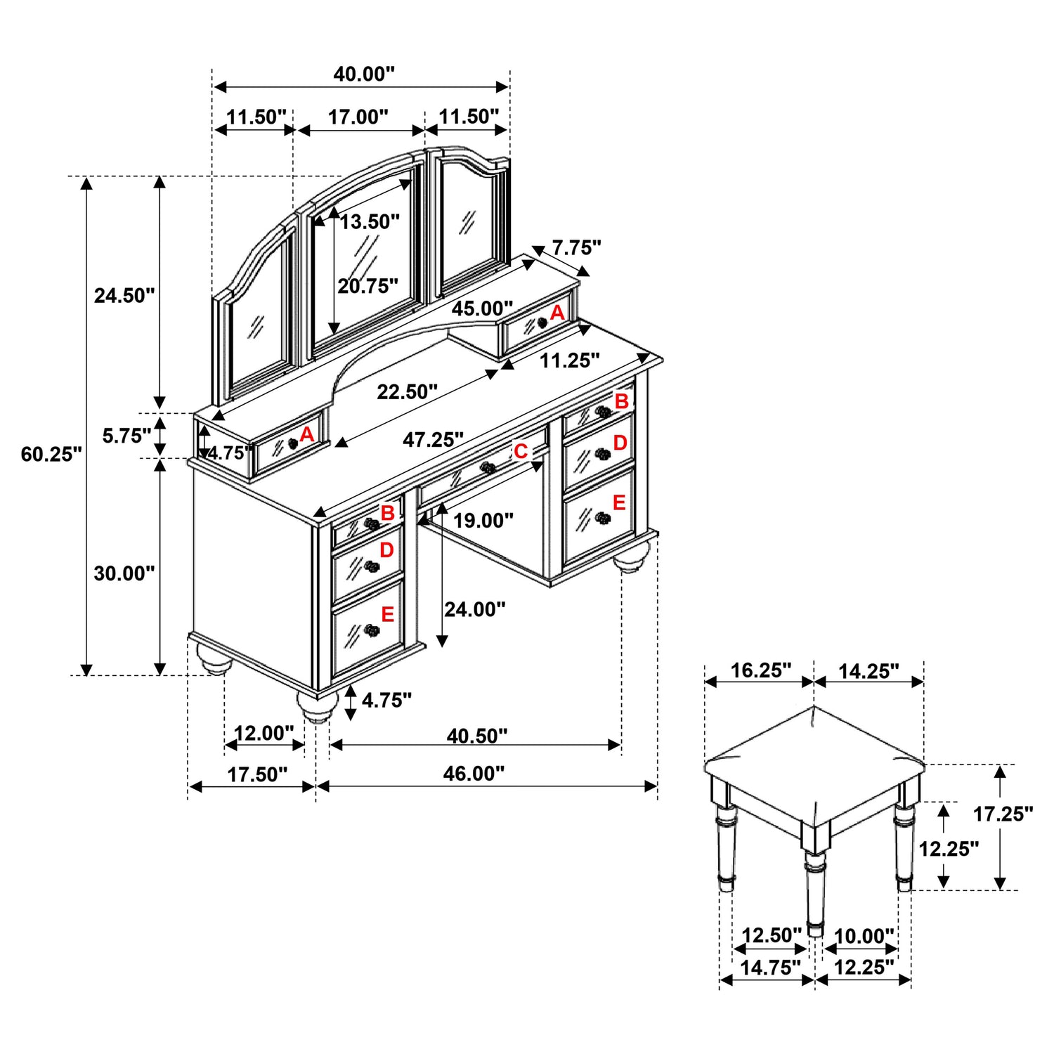 Tocador y espejo: 47,25" de ancho x 18,00" de profundidad x 50,50" de alto